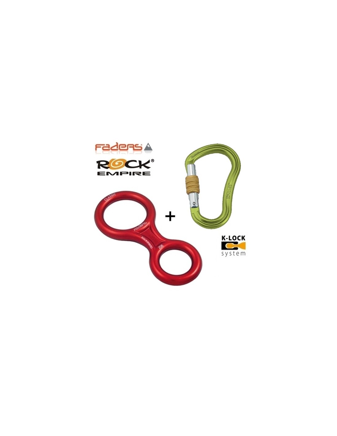 Pack de un descensor en ocho de tamaño grande y con su mosquetón de conjunto. Ideal para rápeles o para hacer los rápeles desembragables en barranquismo.