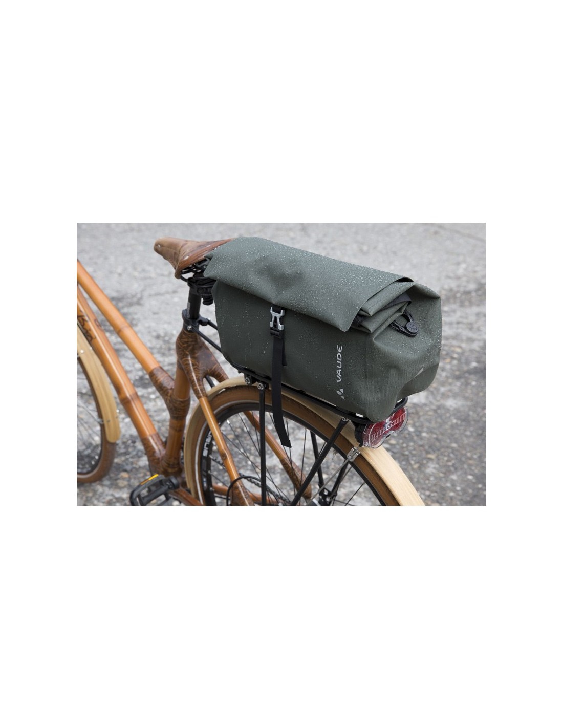Esta bolsa de estante urbana con cierre de rollo y asas de bambú está fabricada con criterios de sostenibilidad en la sede de la empresa VAUDE del sur de Alemania, cerca del lago de Constanza.