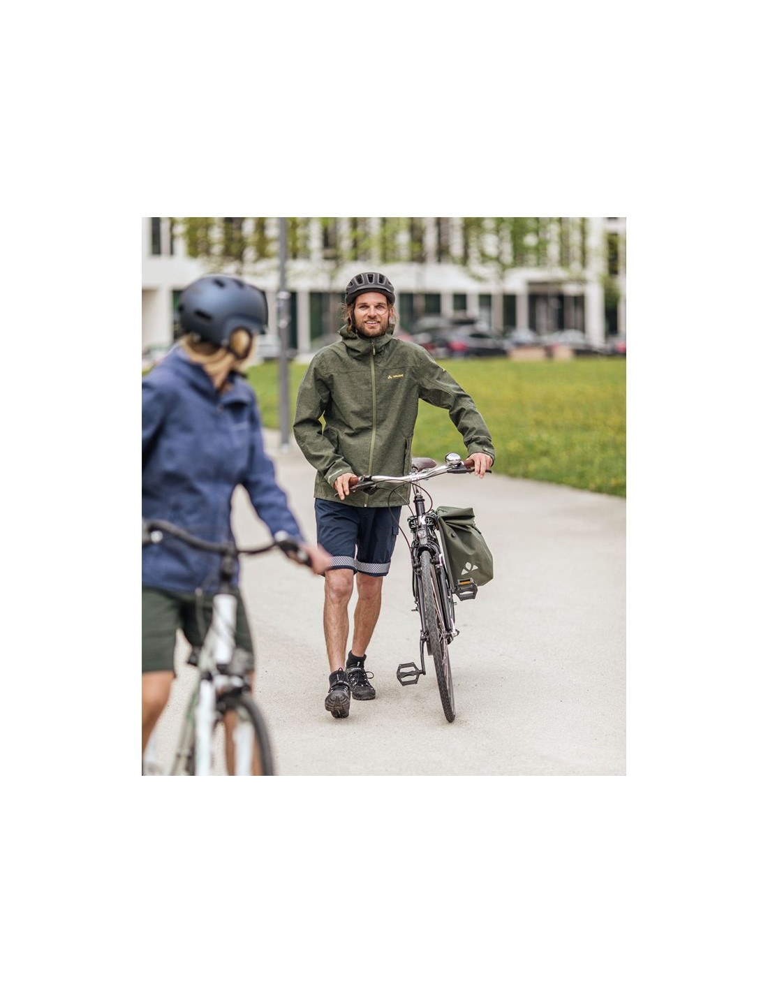 Este portaobjetos urbano con cierre de rollo y asas de bambú está fabricado con criterios de sostenibilidad en la sede de la empresa VAUDE del sur de Alemania, cerca del lago de Constanza.