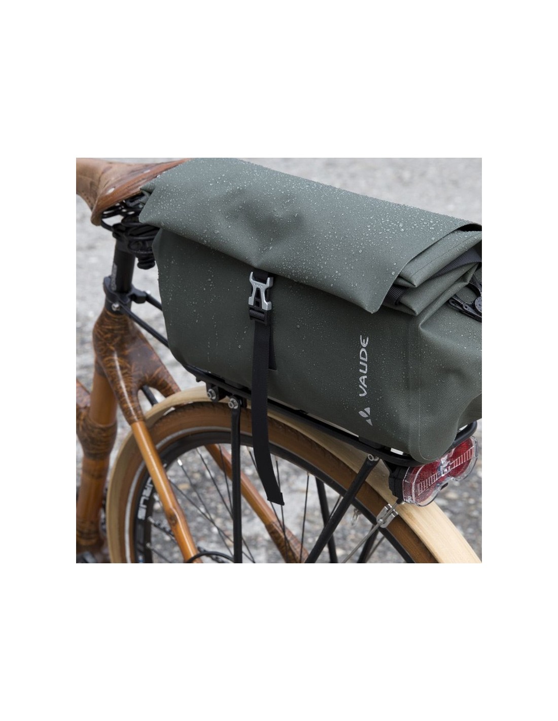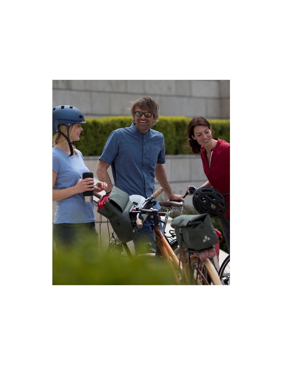 Esta bolsa de estante urbana con cierre de rollo y asas de bambú está fabricada con criterios de sostenibilidad en la sede de la empresa VAUDE del sur de Alemania, cerca del lago de Constanza.