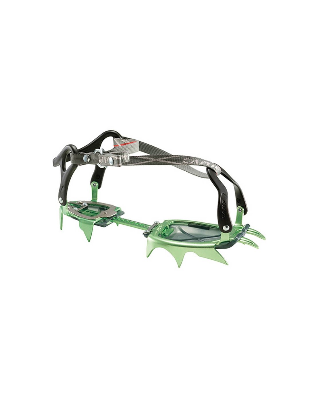 Las fijaciones flexibles en el talón y en la punta, de material termoplástico, y la resistente correa de nylon con anillos metálicos lo adaptan a casi todas las botas (incluso de excursiones).