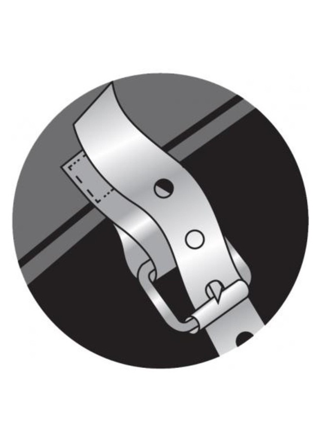 - Se fija a la bota mediante una correa que se ajusta por debajo del calzado. Se termina de acoplar mediante una banda elástica que se agarra a la bota y un gancho en la parte delantera para sujetarlo a los cordones.