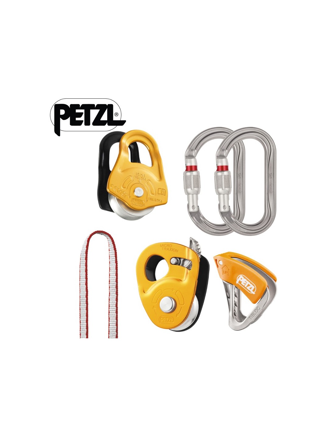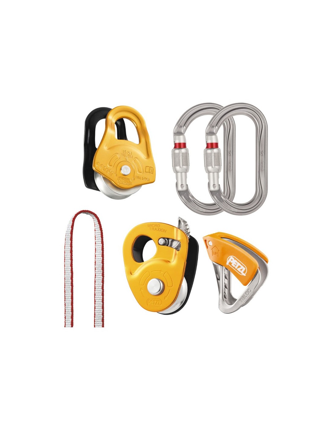 - Contenido del kit: 1 polea MICRO TRAXION, 2 mosquetones OK SCREW-LOCK, 1 TIBLOC, 1 polea PARTNER y 1 cinta ST’ANNEAU 120 cm