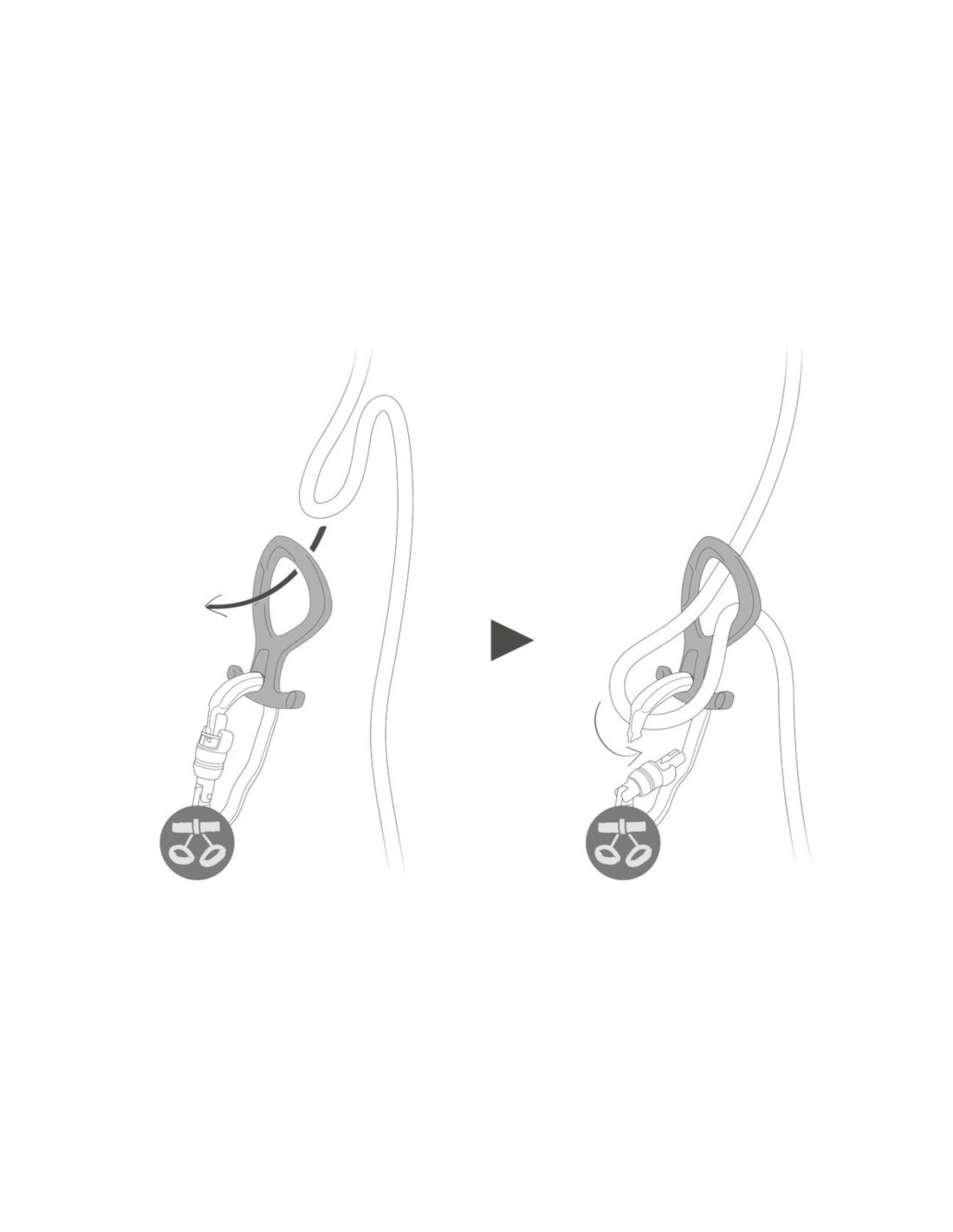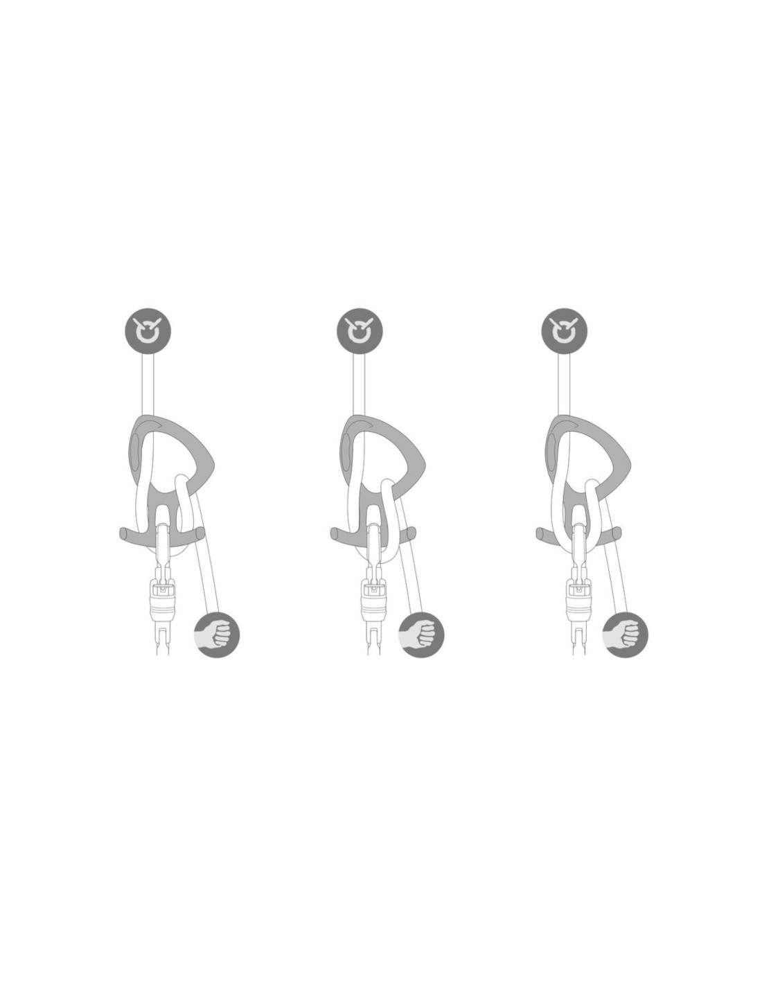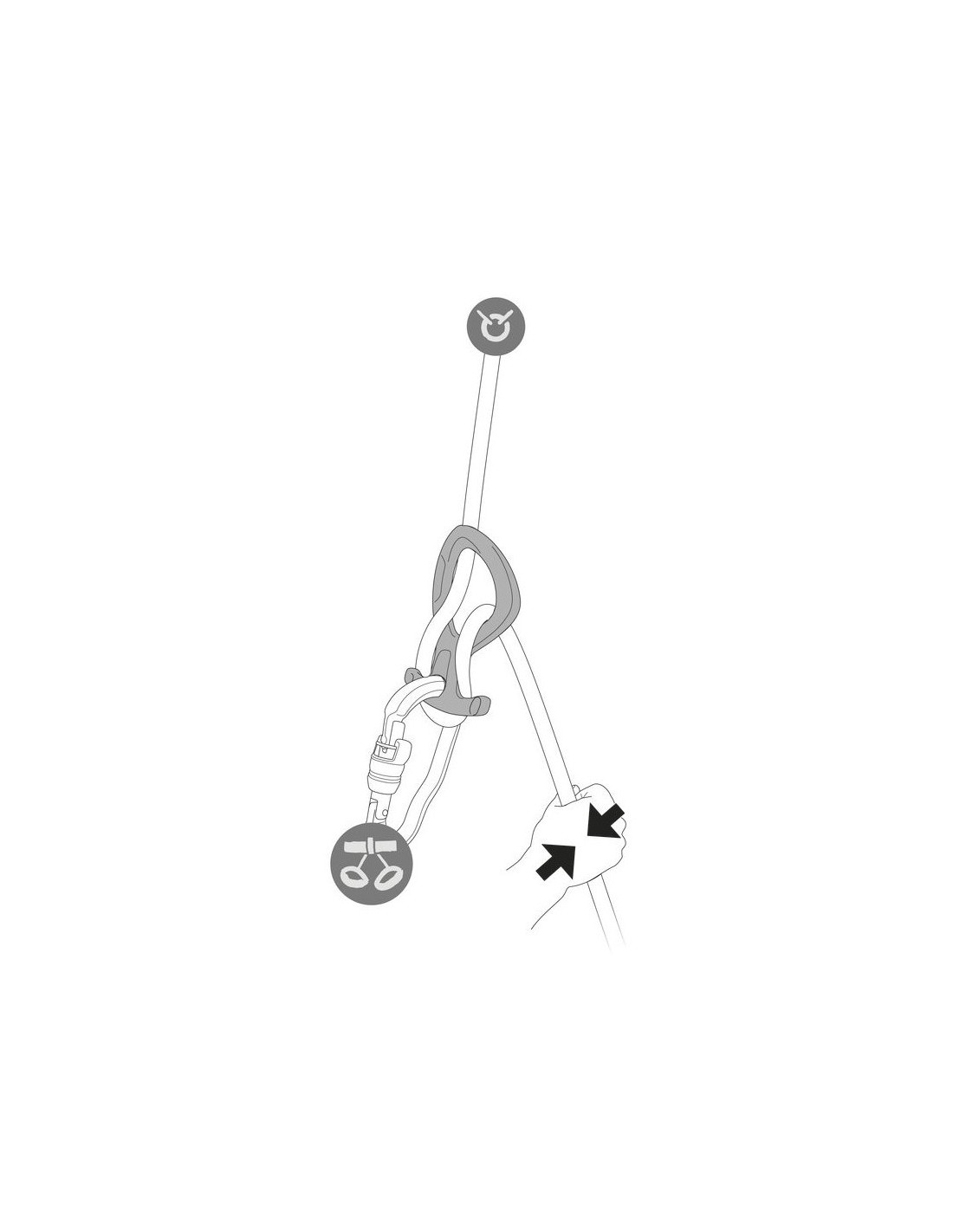 El casquillo plástico facilita la instalación de la cuerda, manteniendo a la vez el aparato conectado al arnés para limitar el riesgo de pérdida.
