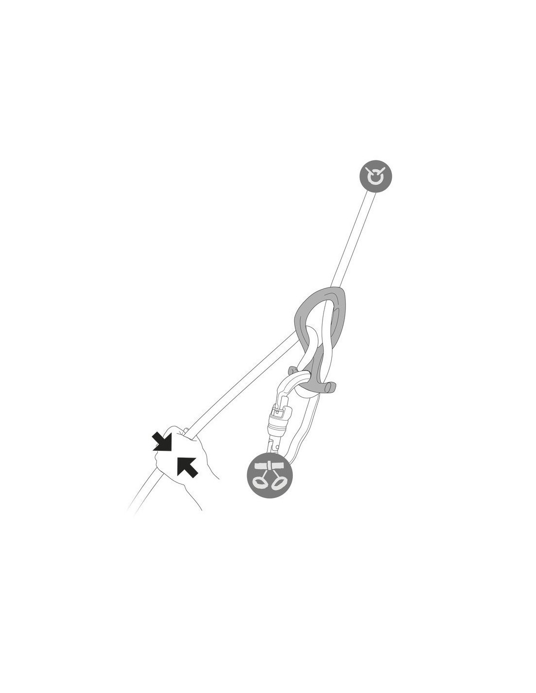 - Casquillo plástico que permite sujetar el conector en la posición correcta para facilitar la instalación de la cuerda, manteniendo a la vez el aparato conectado al arnés para limitar el riesgo de pérdida.