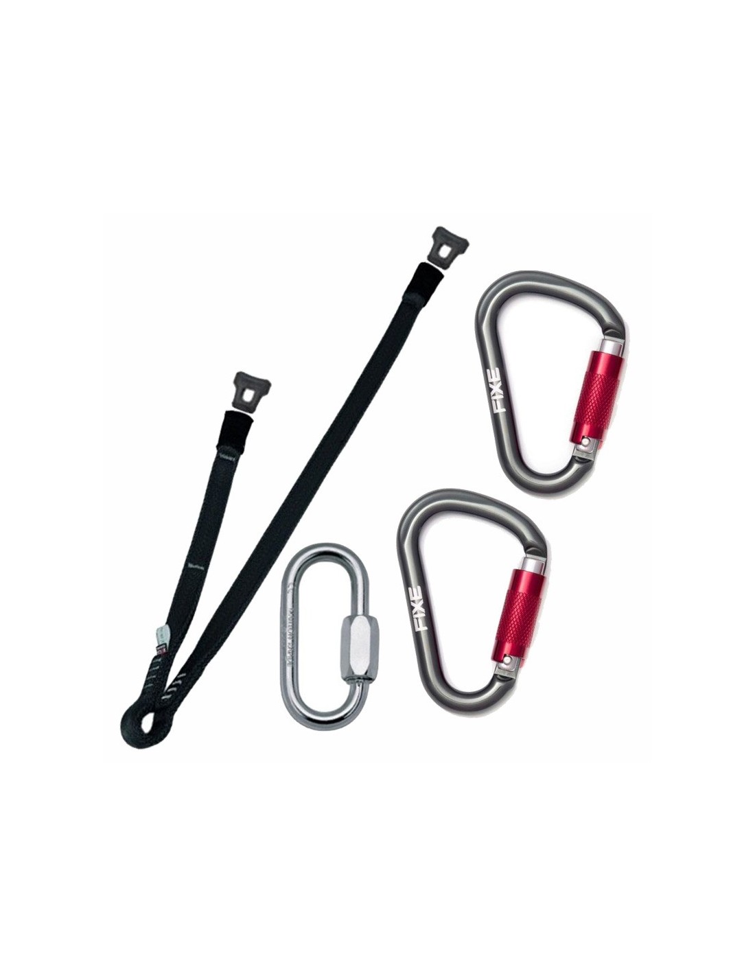 - Se sirve con unas piezas de goma para retener los mosquetones en la posición correcta y proteger los extremos de la abrasión.