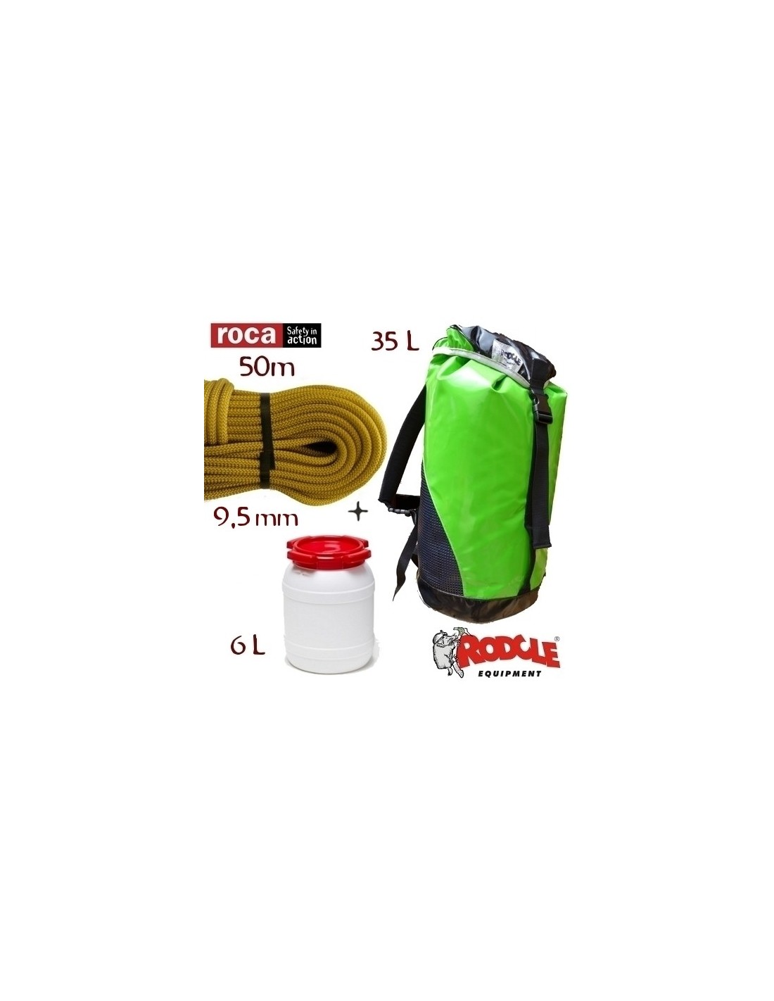 PACK CUERDA CANYON 9,8mm + PETATE RODELLAR + BIDON ESTANCO 6 litros