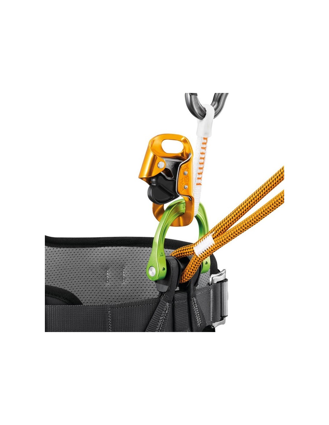 - Punto de enganche ventral ergonómico y posición alta para facilitar la conexión del descensor y optimizar el confort al rapelar. El punto de enganche, con cierre, permite una integración óptima del elemento de amarre DUAL CANYON GUIDE, de un fusible o de un bloqueador ventral CROLL S o L.