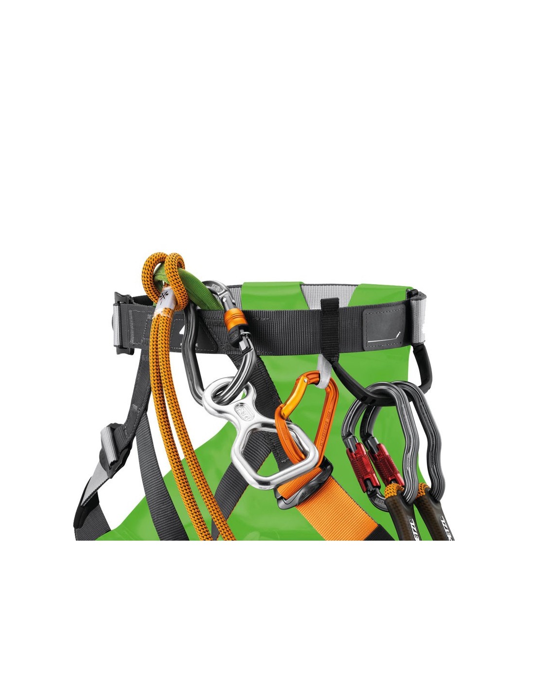 - Un único punto de enganche de color verde e indicación de conexión para una colocación eficaz y un control visual rápido. La posición alta del punto de enganche permite optimizar el confort al rapelar.