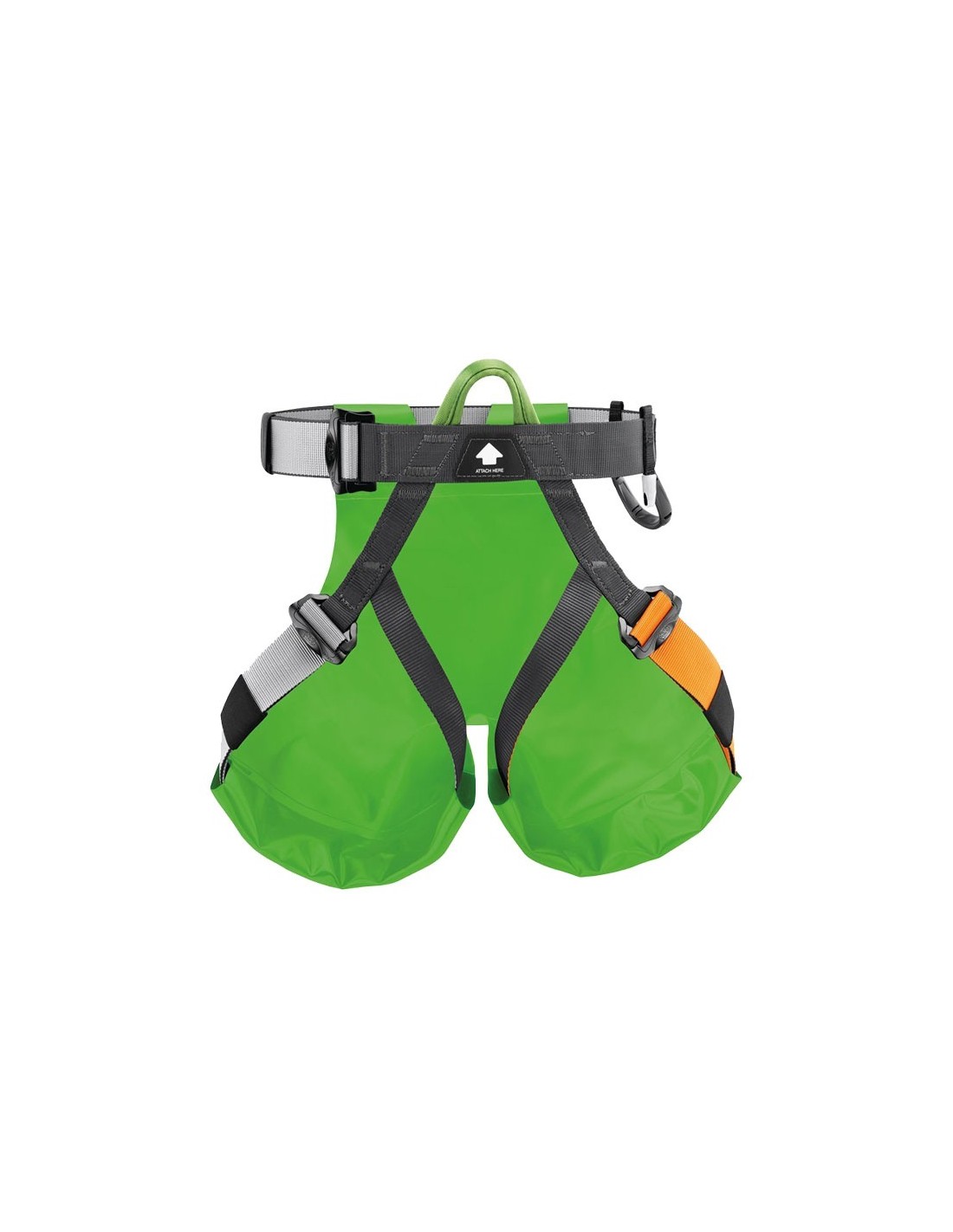 - Un único punto de enganche de color verde e indicación de conexión para una colocación eficaz y un control visual rápido. La posición alta del punto de enganche permite optimizar el confort al rapelar.