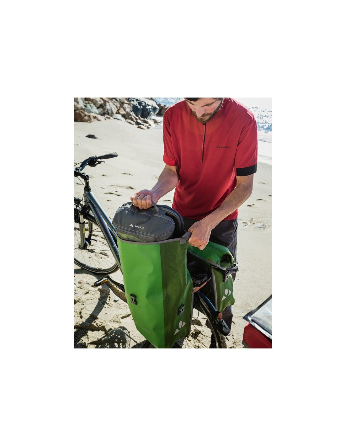 Las alforjas traseras impermeables se fabrican con criterios de sostenibilidad en la sede de la empresa alemana VAUDE, cerca del lago de Constanza, con material de lona duradero y sin PVC para todas tus aventuras.