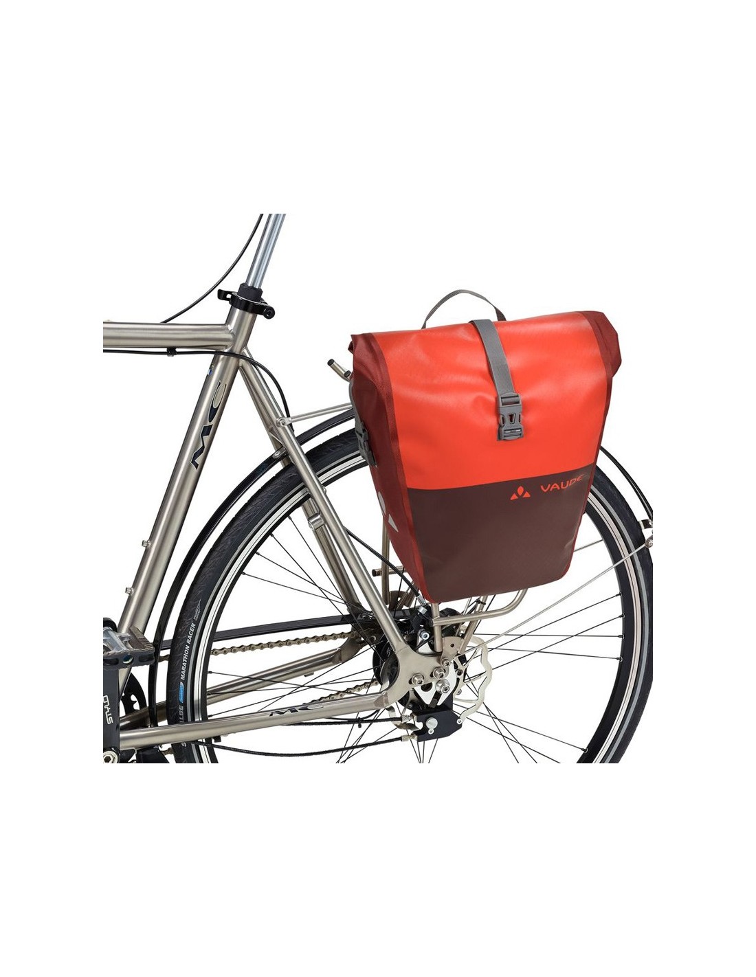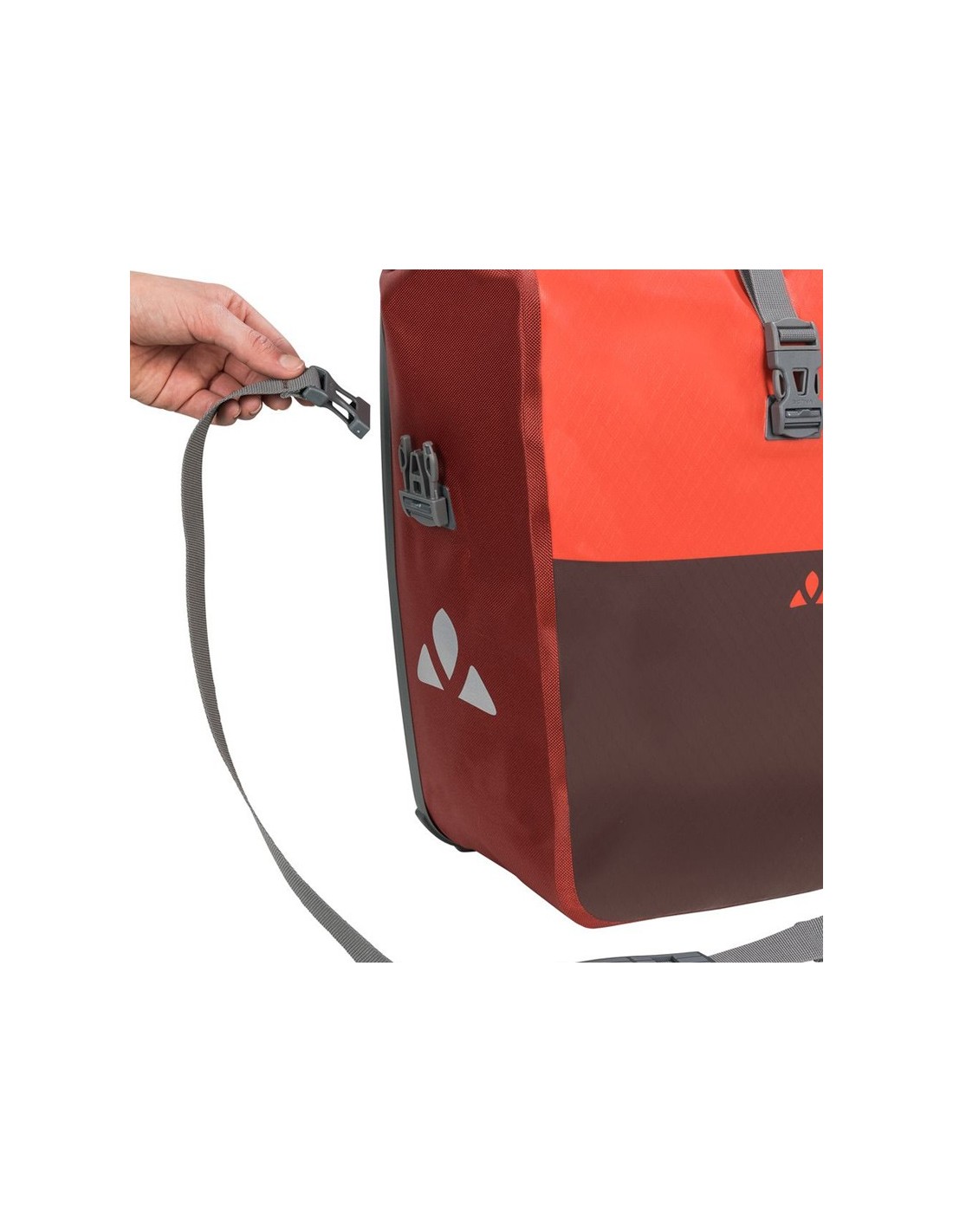 Las alforjas traseras impermeables con un diseño discreto de bloques de color se fabrican con criterios de sostenibilidad en la sede de la empresa alemana VAUDE, cerca del lago Constanza, con material de lona duradero y sin PVC.
