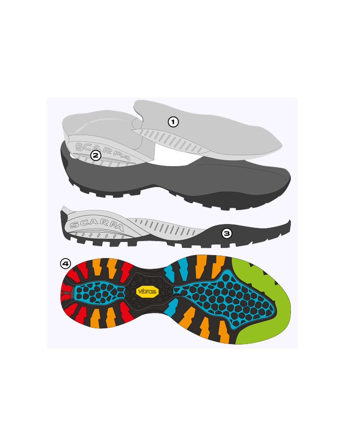 - Suela Spyder con entresuela en EVA para máxima comodidad y absorción de impactos, suela con protección lateral de goma Vibram®.