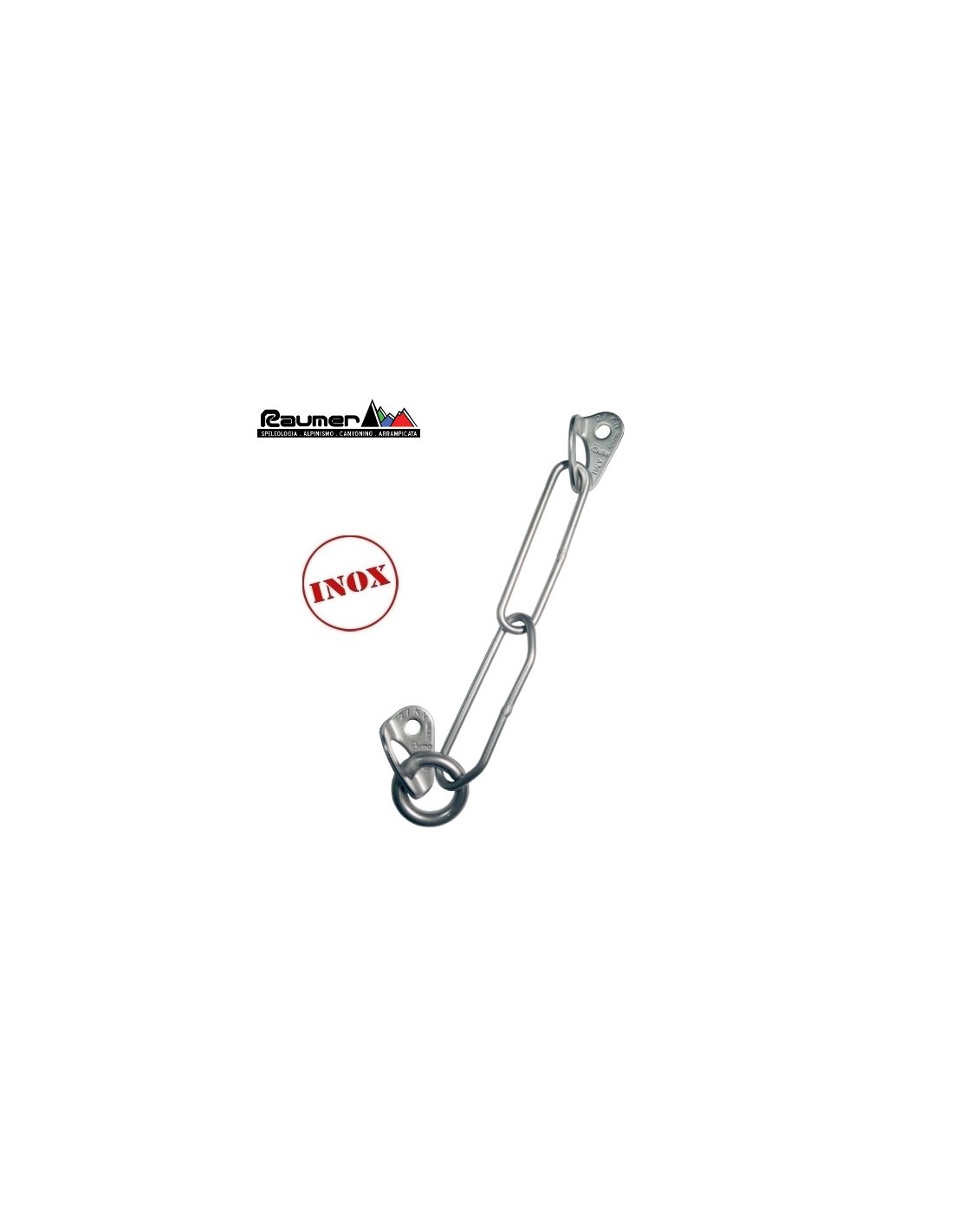 Grupo descuelgue inox. de la marca Raumer con un solo anillo de rapel. El uso de este descuelgue supone el uso de un mosquetón personal para su uso en "top rope", que eventualmente se recuperara una vez terminada la escalada. Si se instala en un eje idóneo, nada impide de usar el único anillo en la clásica “moulinette”.