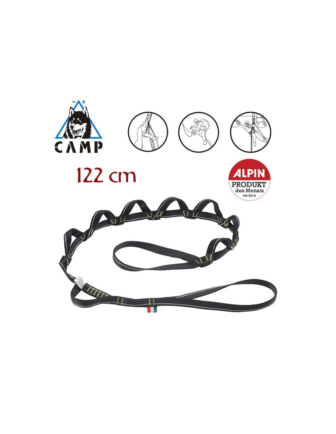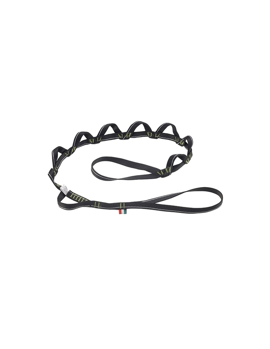 Innovadora Daisy Chain de poliéster de 16 mm, con estructura en espiral que impide que el mosquetón se suelte en caso de enganche accidental en 2 anillos adyacentes y la eventual rotura de la costura intermedia.