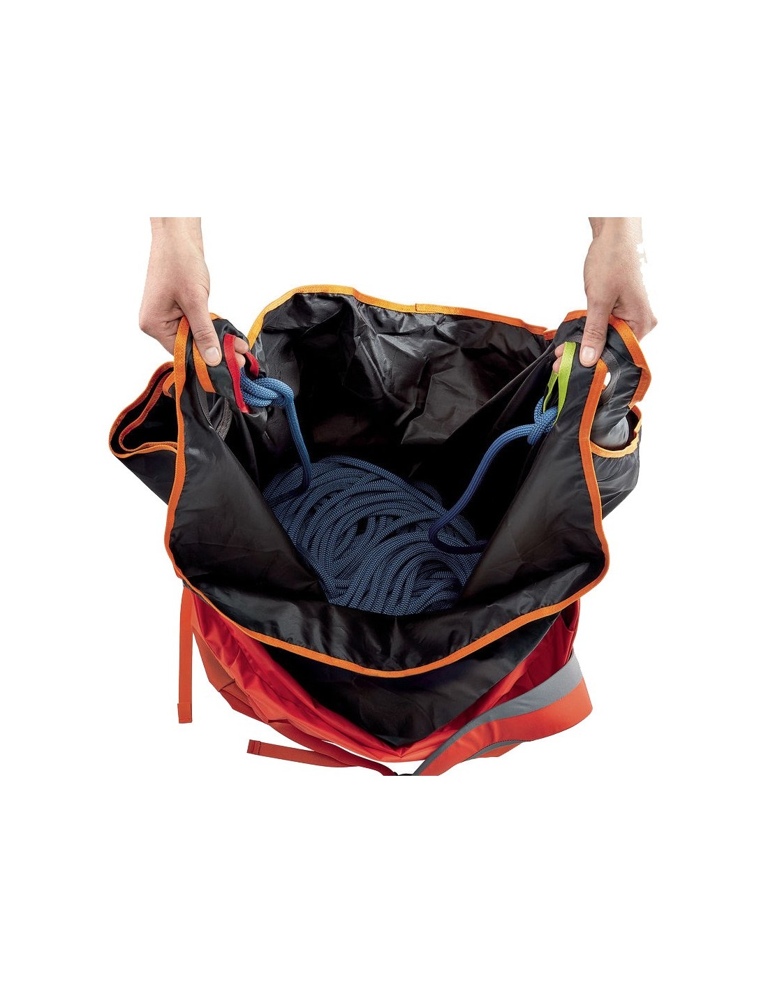 - Gran volumen de 36 litros, que permite llevar hasta 100 m de cuerda o una cuerda doble, así como todo el material de escalada (arnés, cintas exprés, pies de gato...).