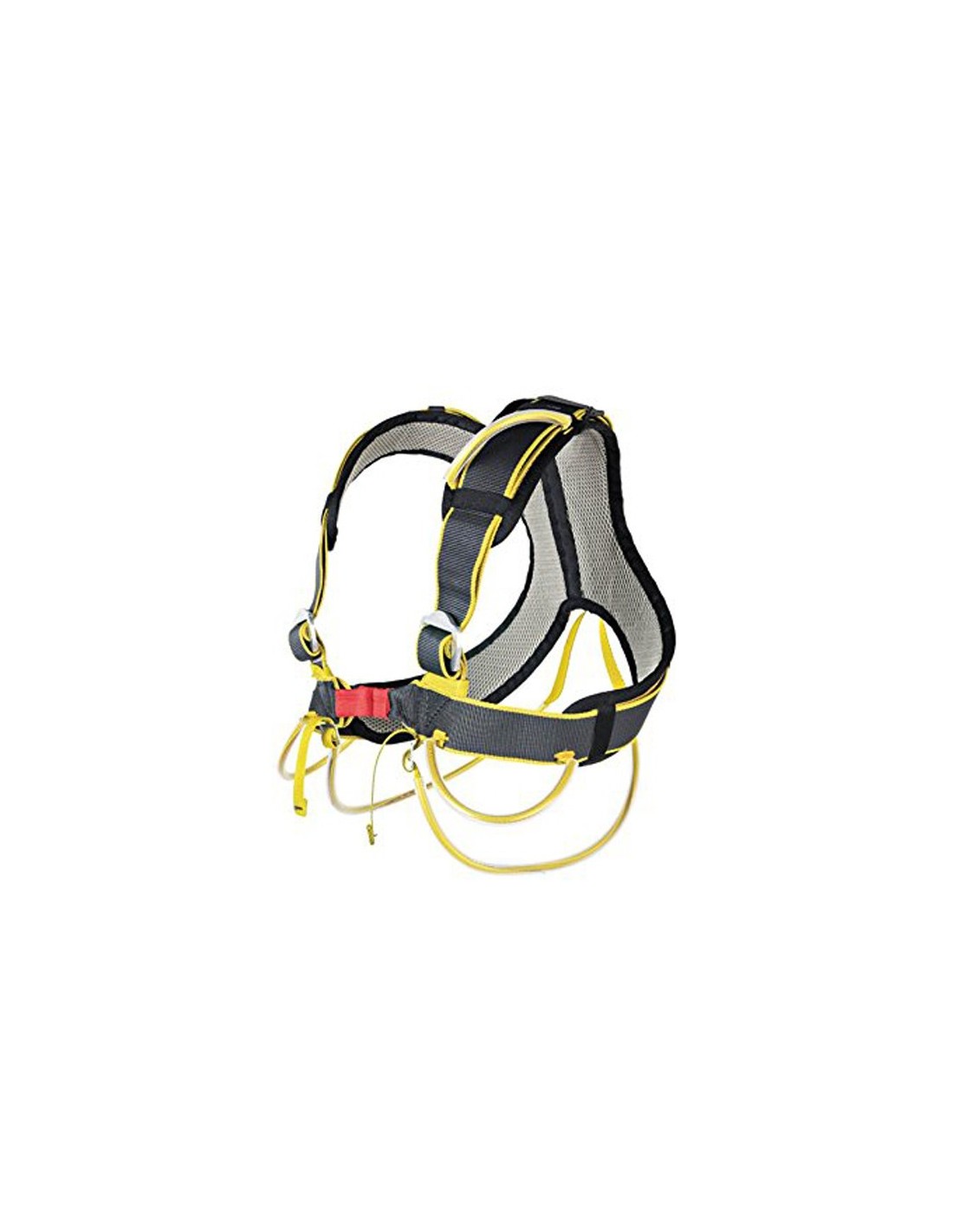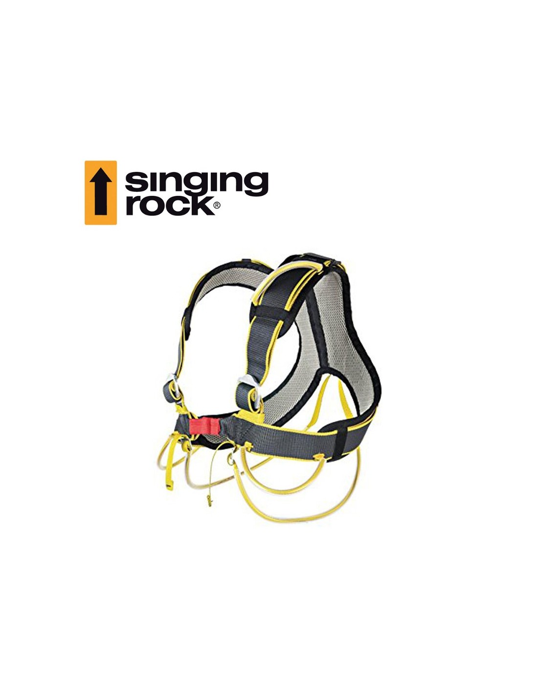 Singing Rock Arnés de pecho Aladin debe utilizarse junto a un arnés de asiento. Sirve para mejorar la posición del cuerpo en caso de caída, mientras se está colgado.