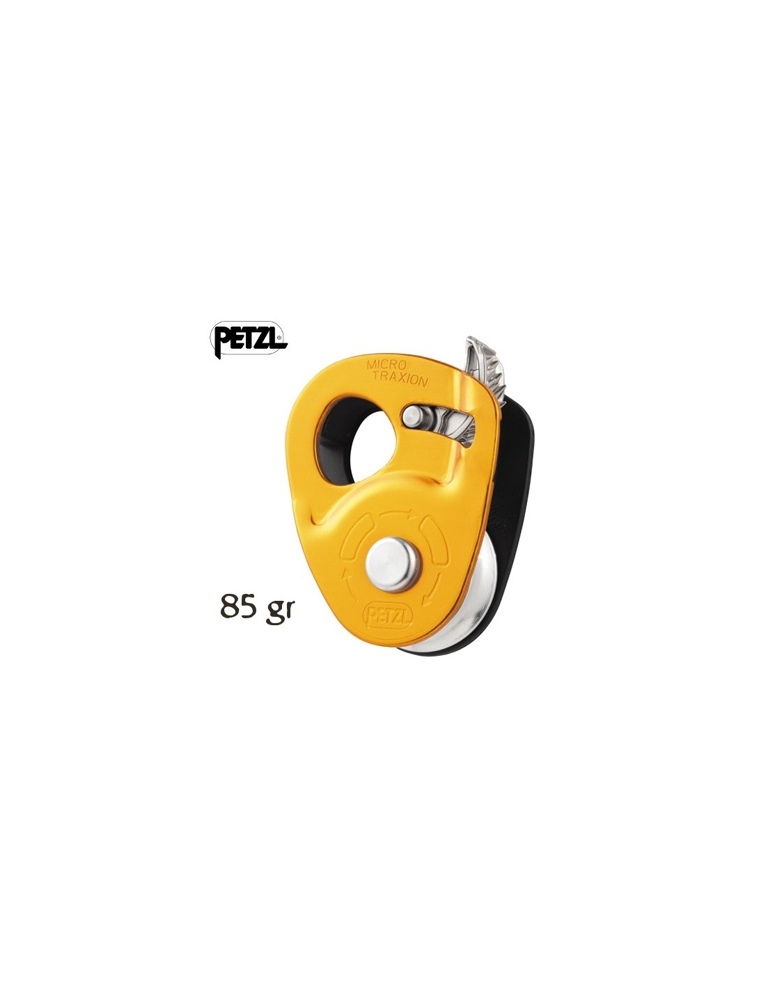 La MICRO TRAXION de Petzl es una polea con bloqueador ultraligera (85 g) y ultracompacta con un excelente rendimiento (91 %) gracias al rodamiento de bolas.