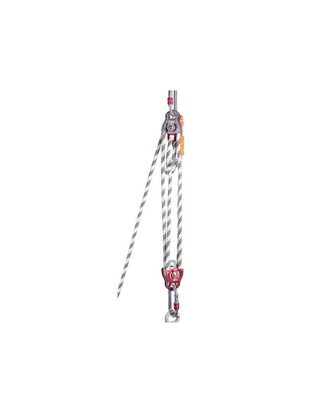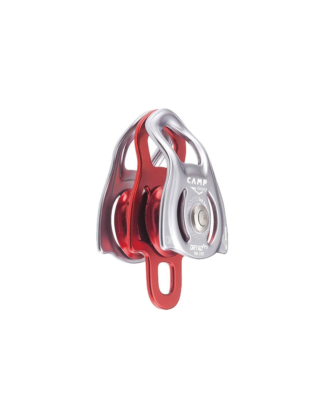 Polea doble compacta para montar polipastos. Presenta las mismas características que el modelo Dryad (doble rueda, orificio de anclaje para dos mosquetones y orificio secundario inferior), pero con rotación sobre cojinetes de bolas estanco para una mayor eficiencia con un uso intensivo y a alta velocidad.
