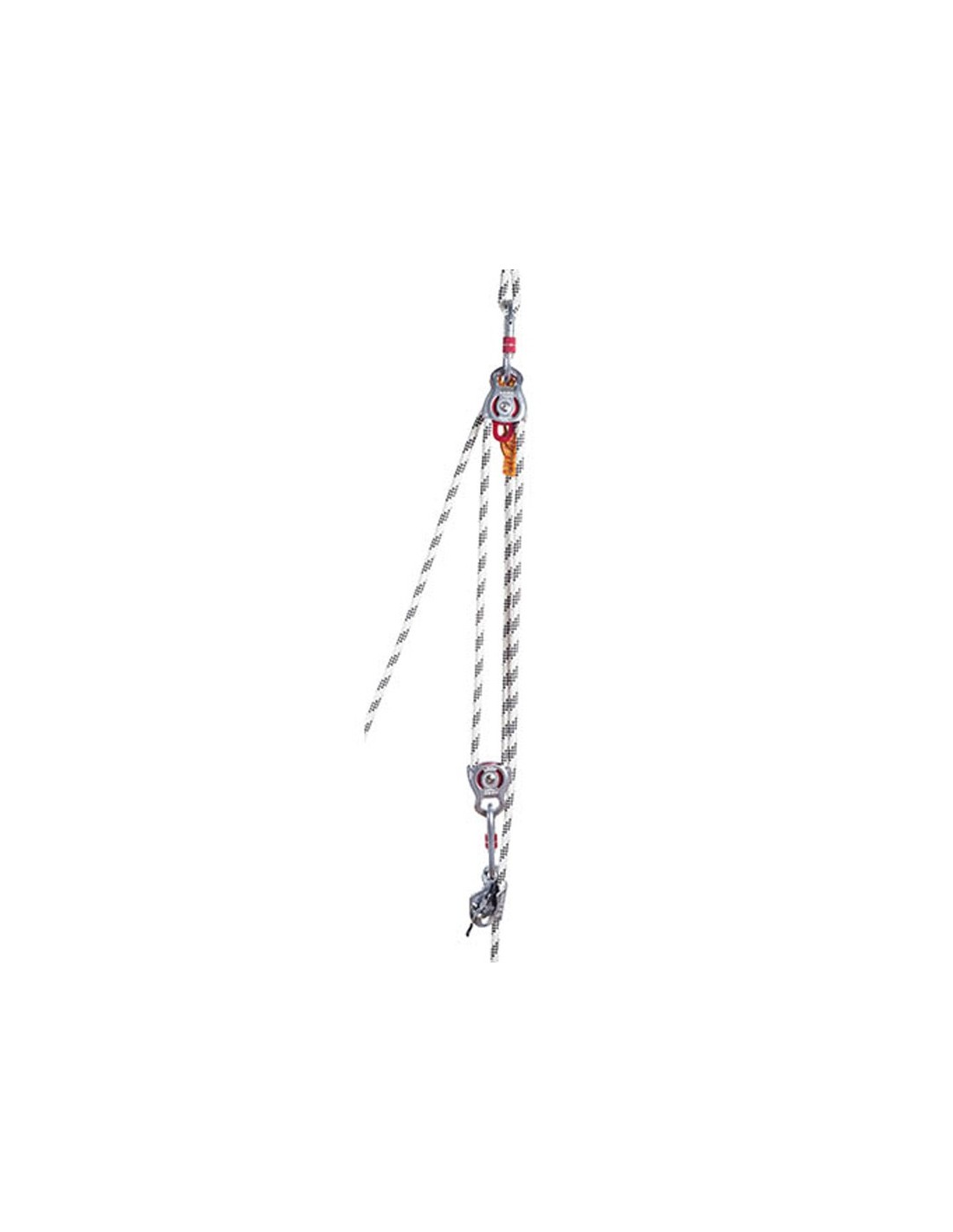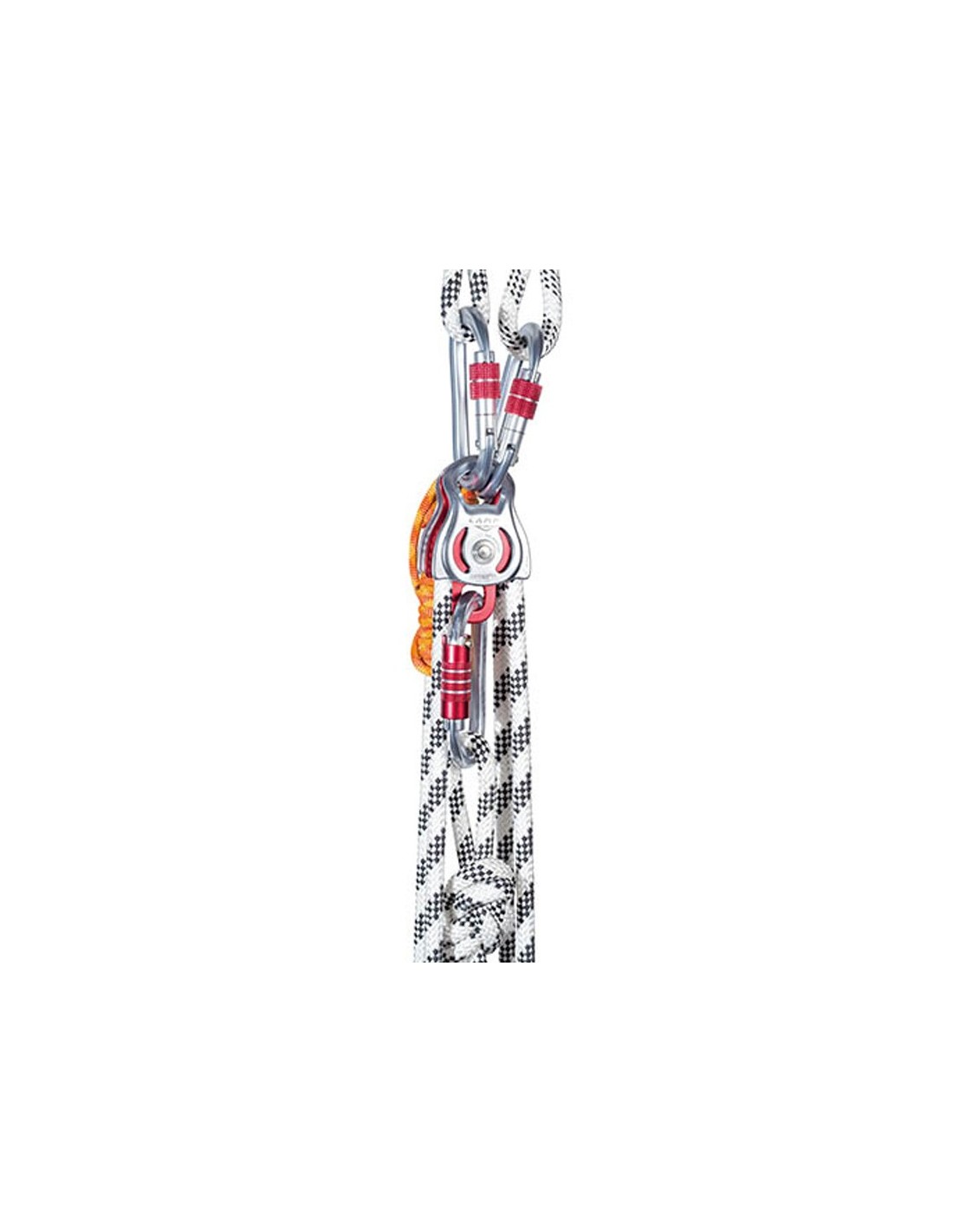 Se puede utilizar con un nudo autoblocante, que es posible instalar a ambos lados y entre las dos ruedas (se recomienda usar cuerda de aramida).
