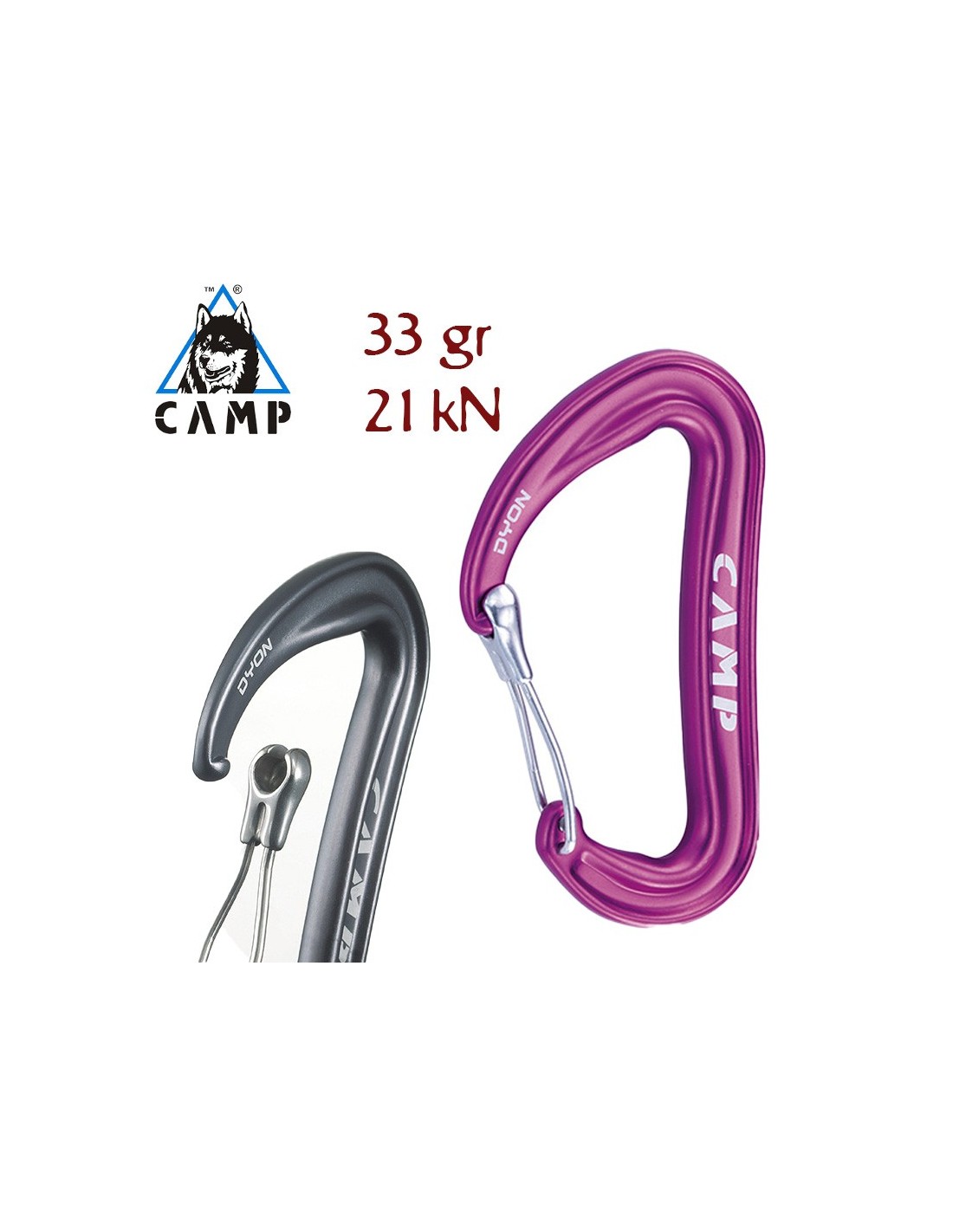 El mosquetón Dyon, en la práctica, está equipado con palanca de cierre al ras provista de un inserto especial, que permite la conexión entre la palanca y el mosquetón sin el diente incómodo que caracteriza a los mosquetones Wire.