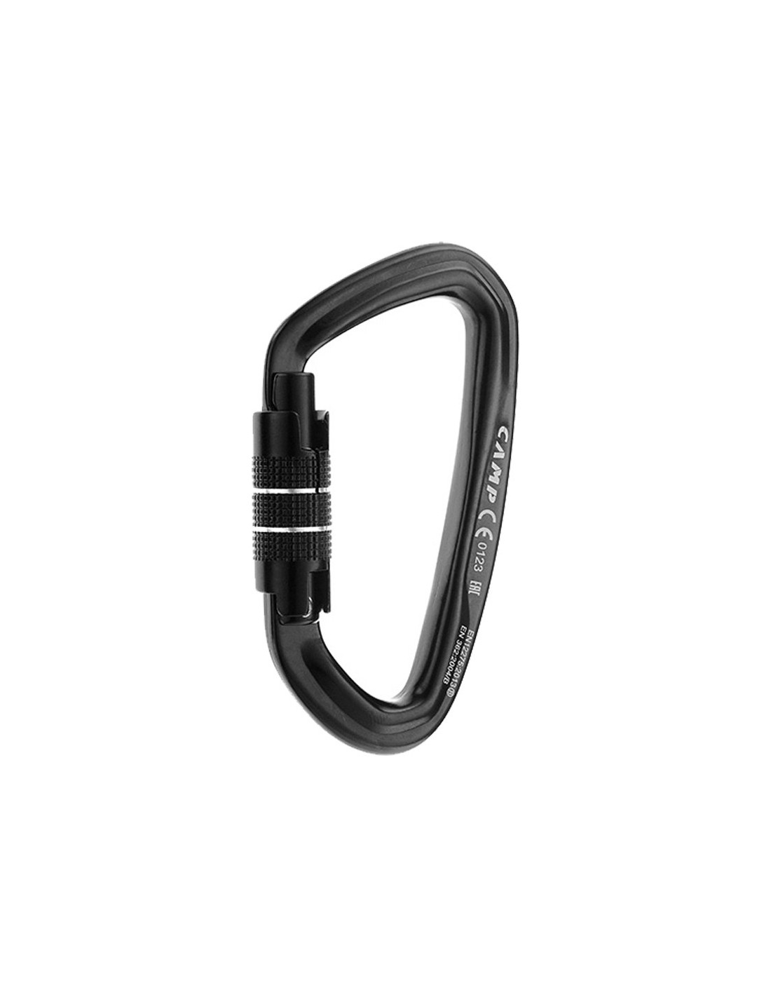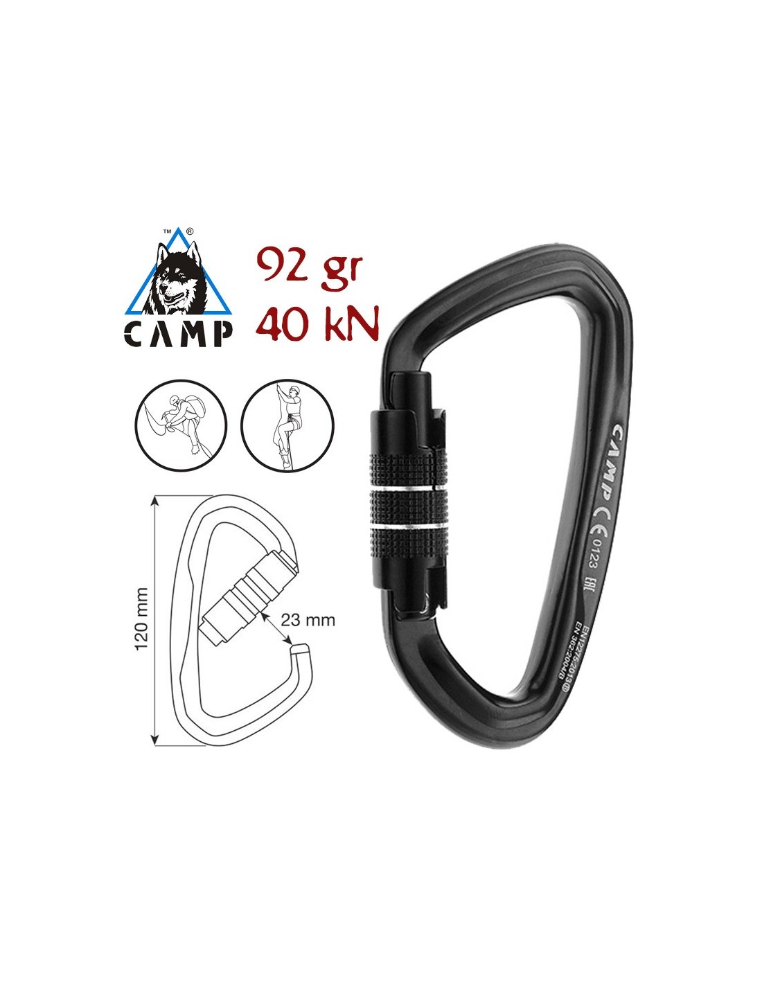 - Cierre automático que requiere dos acciones (girar y presionar) para abrir el mosquetón.
