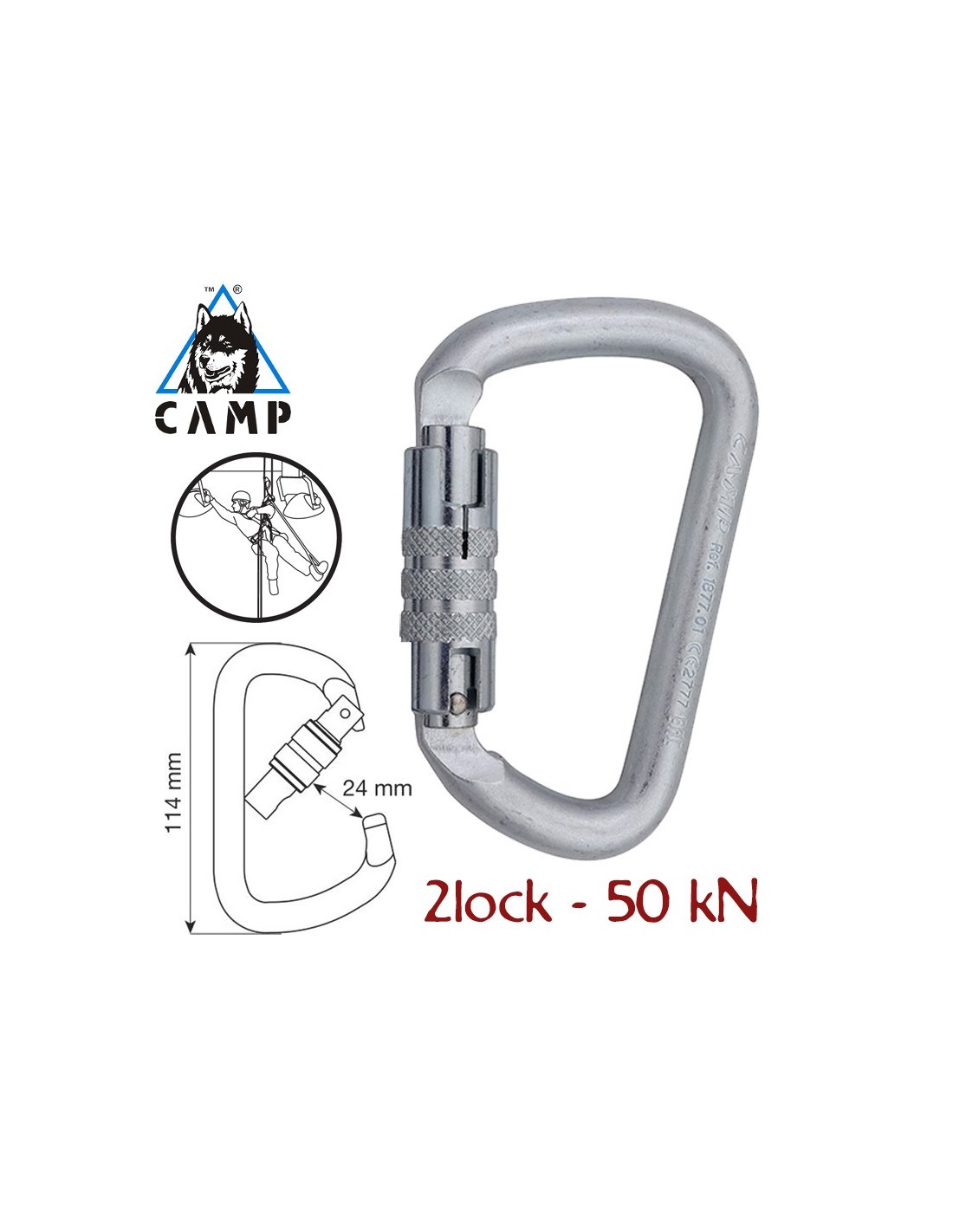 - Cierre automático que requiere dos acciones (girar y presionar) para abrir el mosquetón.