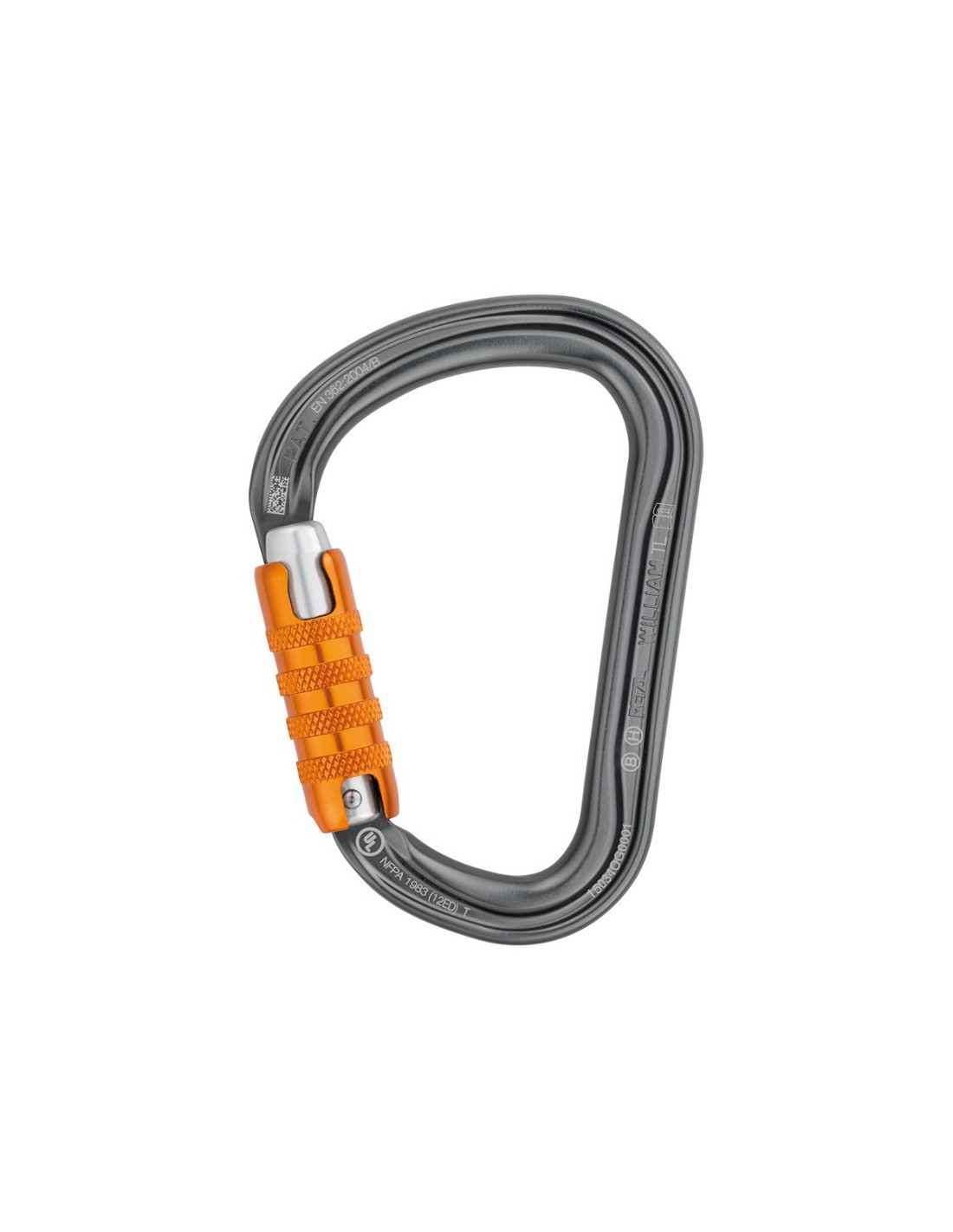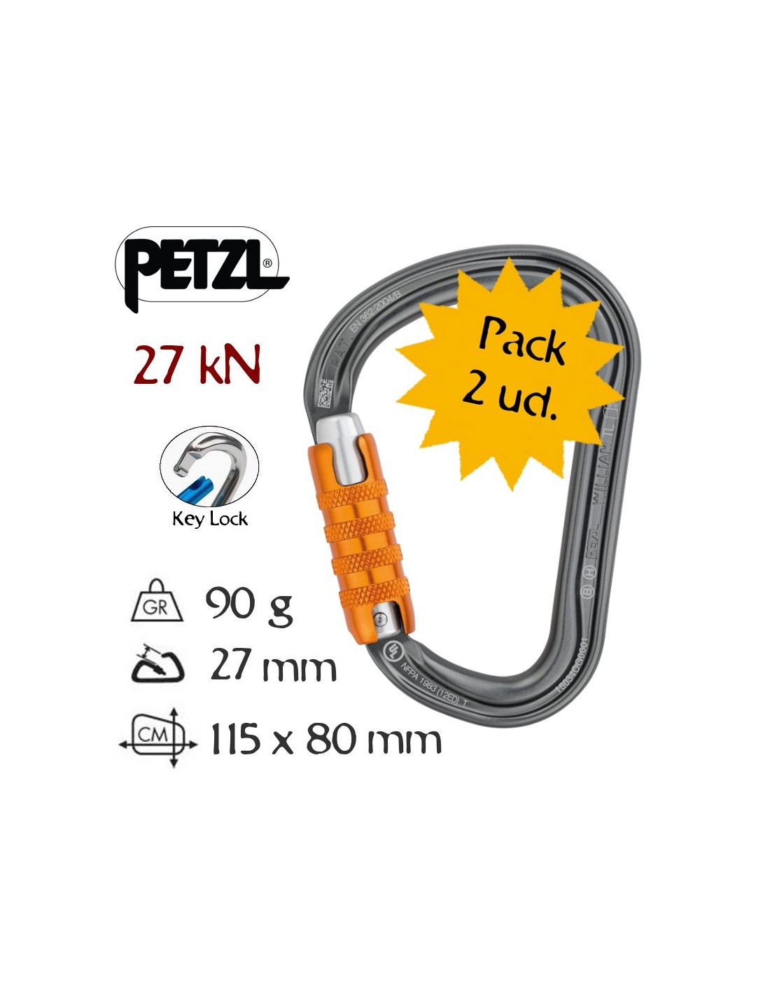 PACK 2 MOSQUETONES WILLIAM TRIACT-LOCK DE PETZLMosquetón asimétrico ligero de gran capacidad.El mosquetón asimétrico y ligero de gran capacidad WILLIAM está fabricado con aluminio. Tiene una forma de pera práctica para conectar fácilmente varios elementos. Su diseño interior fluido y el sistema Keylock facilitan las manipulaciones. El WILLIAM se puede combinar con la barra CAPTIV para favorecer la solicitación del mosquetón según el eje mayor, limitar el riesgo de volteo y solidarizarlo con el aparato.DescripciónForma de pera que ofrece una capacidad y una abertura importantes: - Facilita la conexión de varios elementos. - Permite realizar un nudo dinámico en caso de emergencia. Mosquetón de aluminio cuya ligereza reduce el peso del equipo transportado por el trabajador en altura. Facilita las manipulaciones: - Diseño interior fluido que limita el riesgo de punto estable y facilita la rotación del mosquetón. - Sistema Keylock para evitar cualquier enganche involuntario del mosquetón. Perfil en H: - Asegura la mejor relación resistencia/ligereza. - Protege los marcados de la abrasión. Sistema de bloqueo de seguridad TRIACT-LOCK: bloqueo automático con apertura de triple acción. CARACTERÍSTICAS- Material: Aluminio