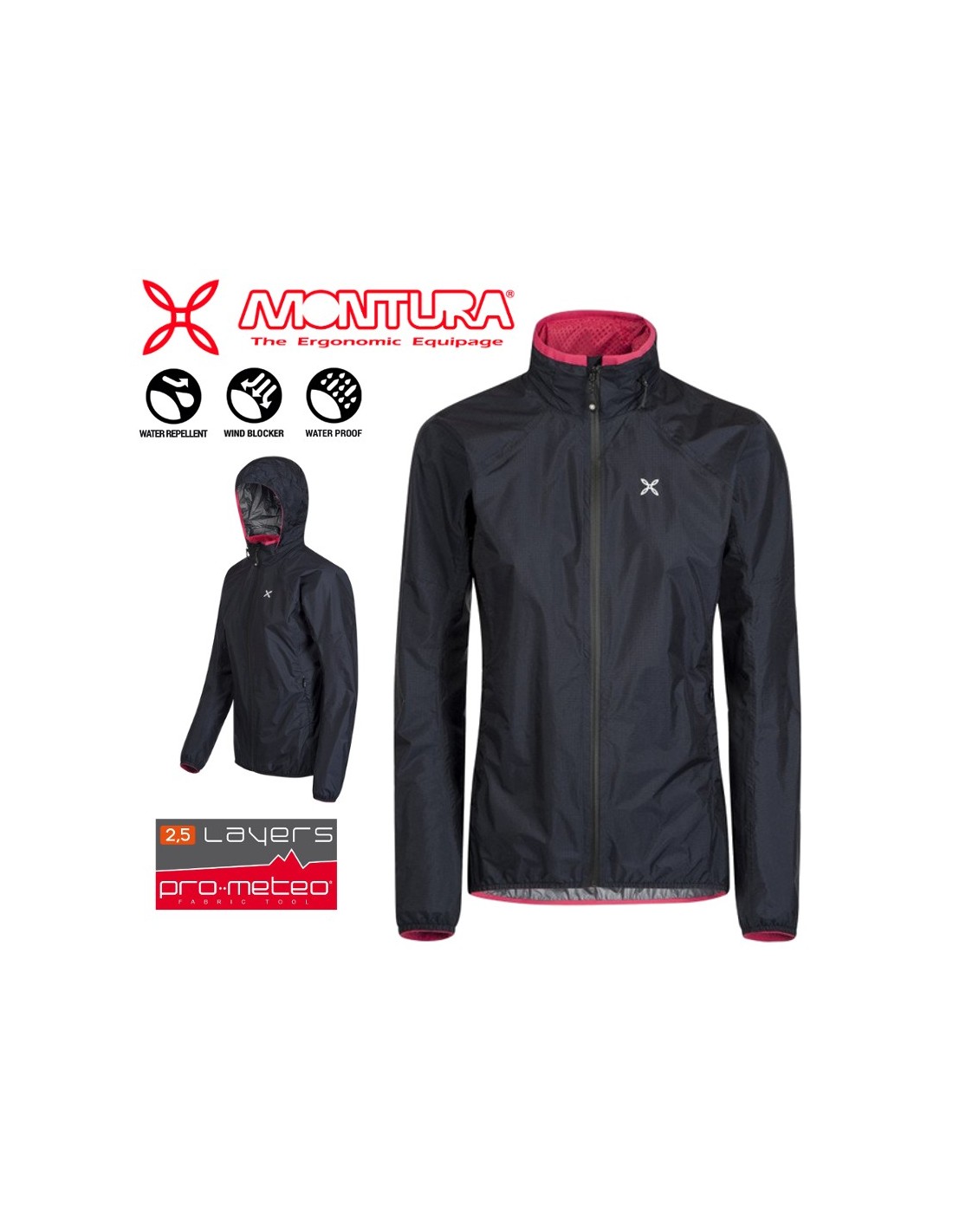 - Textura primaria: Tejido de nylon superligero de 2.5 capas laminado con una membrana de poliuretano transpirable (15,000 g / m2 / 24h), resistente al viento, impermeable (columna de agua de 15,000 mm).