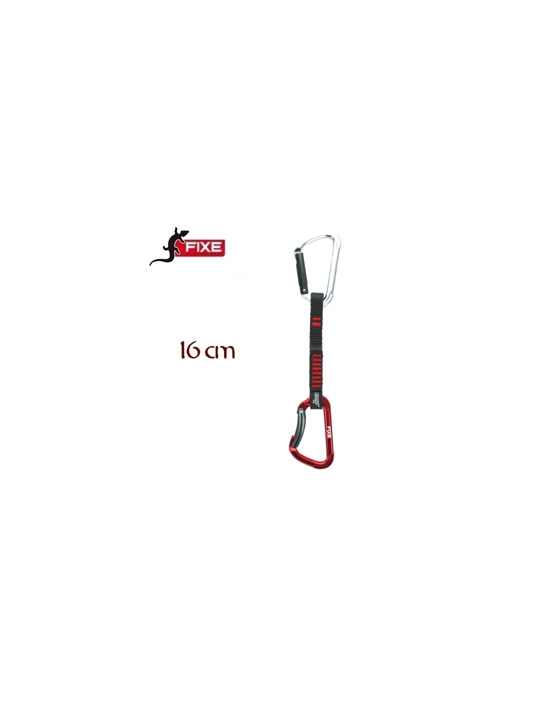 Conjunto de cinta express, formado por una cinta de poliéster de 16 mm de ancho y dos mosquetones FIXE modelo MONTGRONY uno recto i el otro curvo.