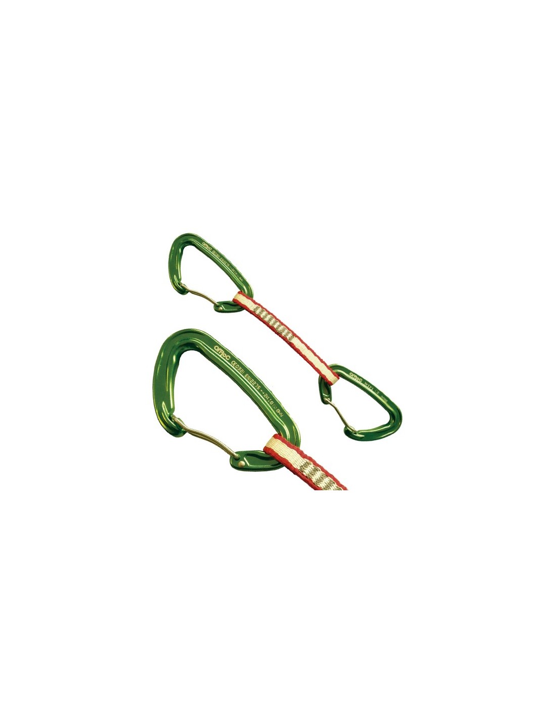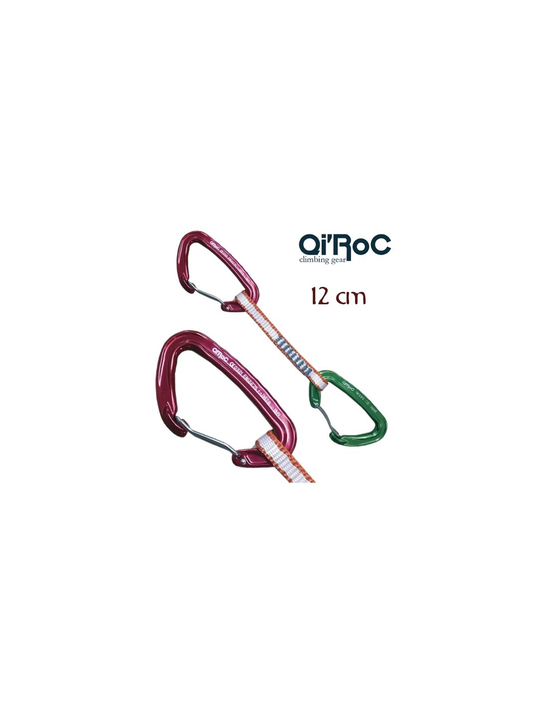 El Set dyneema wifi de Qi'Roc es un set express ULTRALIGERO compuesto de una cinta express de dyneema de 12 cm de longitud y sólo 10mm de ancho y dos mosquetones wifi de cierre alambre uno recto y el otro curvo.