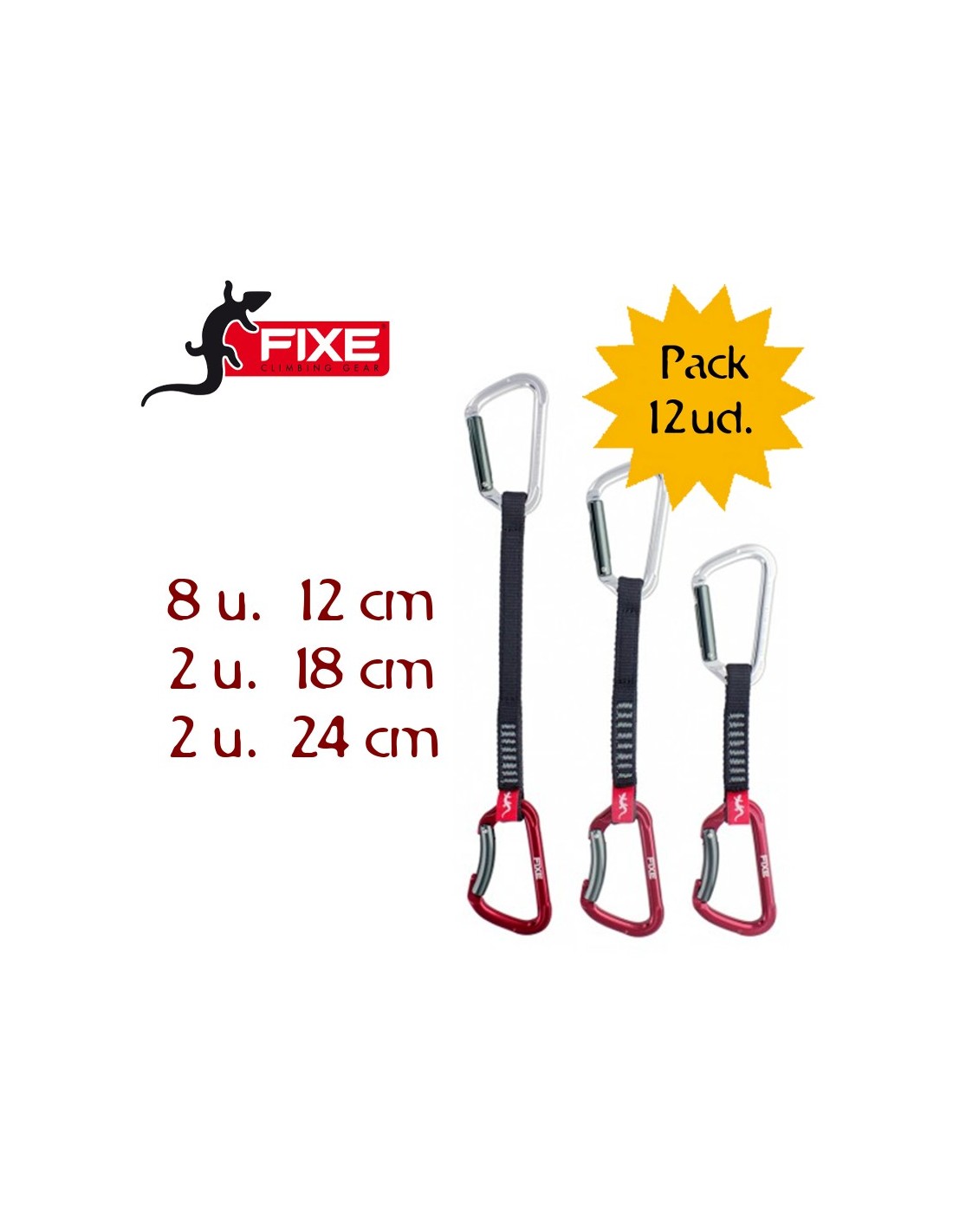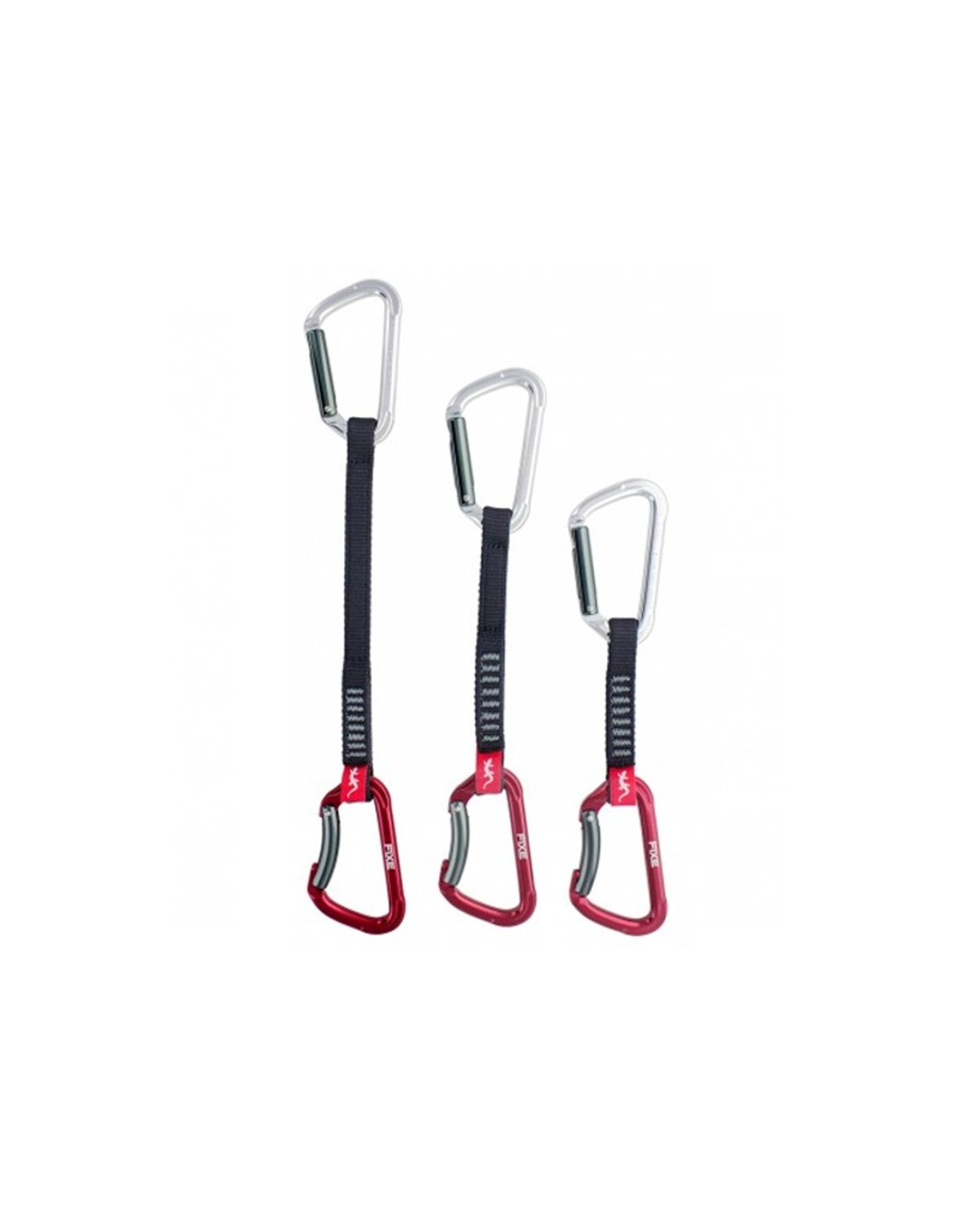 Conjunto de cinta express, formado por una cinta de poliéster de 16 mm de ancho y dos mosquetones FIXE modelo MONTGRONY uno recto i el otro curvo.