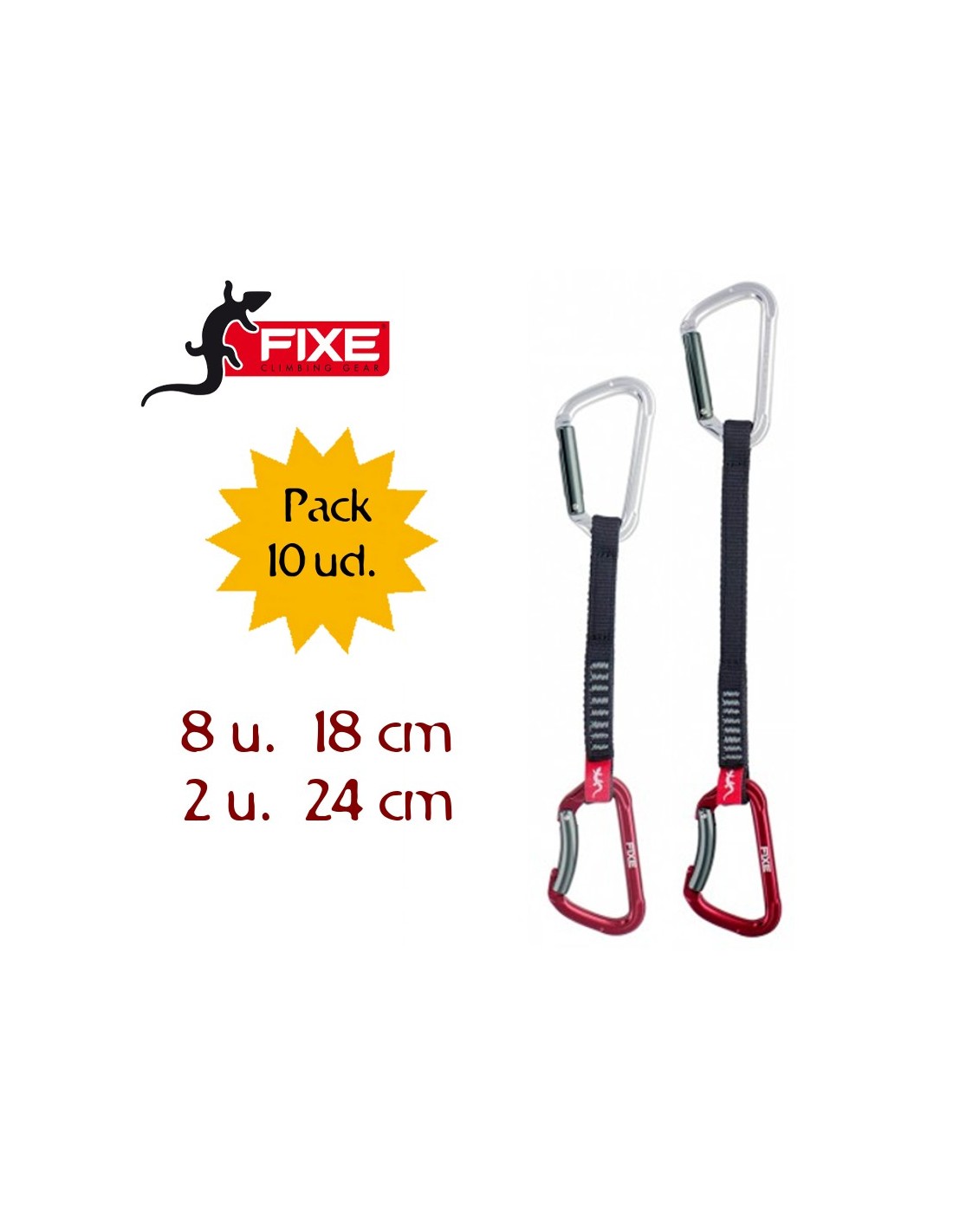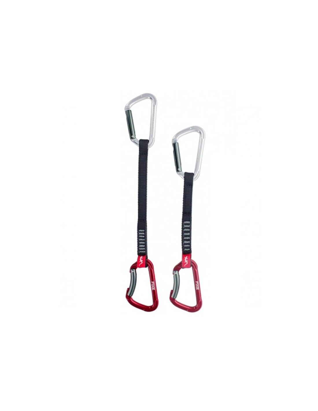 Conjunto de cinta express, formado por una cinta de poliéster de 16 mm de ancho y dos mosquetones FIXE modelo MONTGRONY uno recto i el otro curvo.