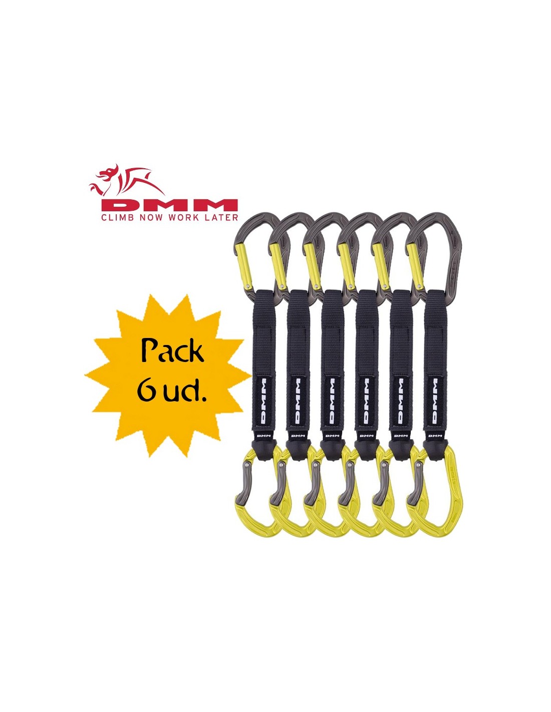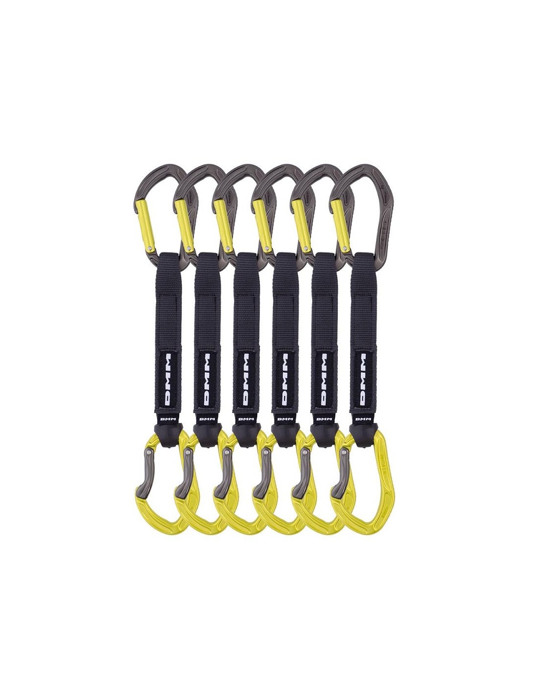 Pack de 6 cintas express de la marca DMM compuestas por el mosquetón Pro en la parte superior y el mosquetón Clip en la parte inferior, unidos por una cinta de nylon, resistente y segura.
