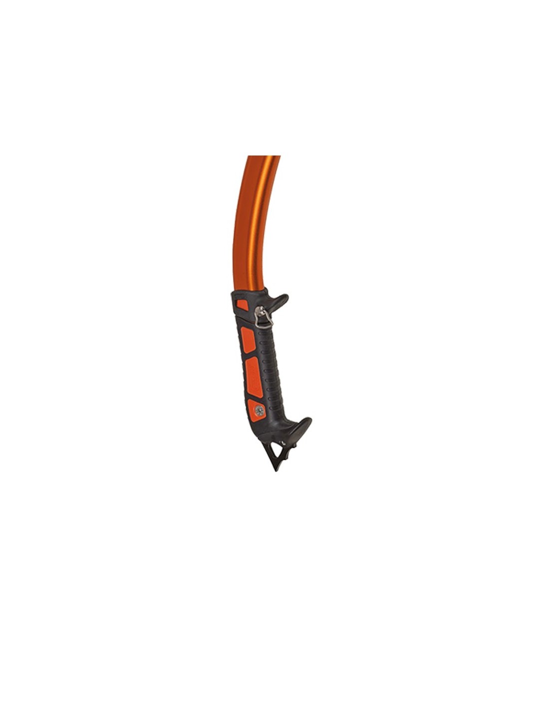 La punta de acero intercambiable es lo suficientemente grande como para anclarse al hielo glaciar de ángulo bajo y tiene un orificio lo suficientemente grande como para sujetar un mosquetón para usar con cintas disipadoras.