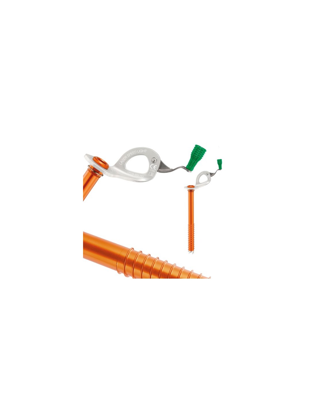 Tornillo para hielo de la marca Petzl, modelo Laser Speed Light, ultraligero, sólo 110 g, para llevar el mínimo peso en alpinismo.