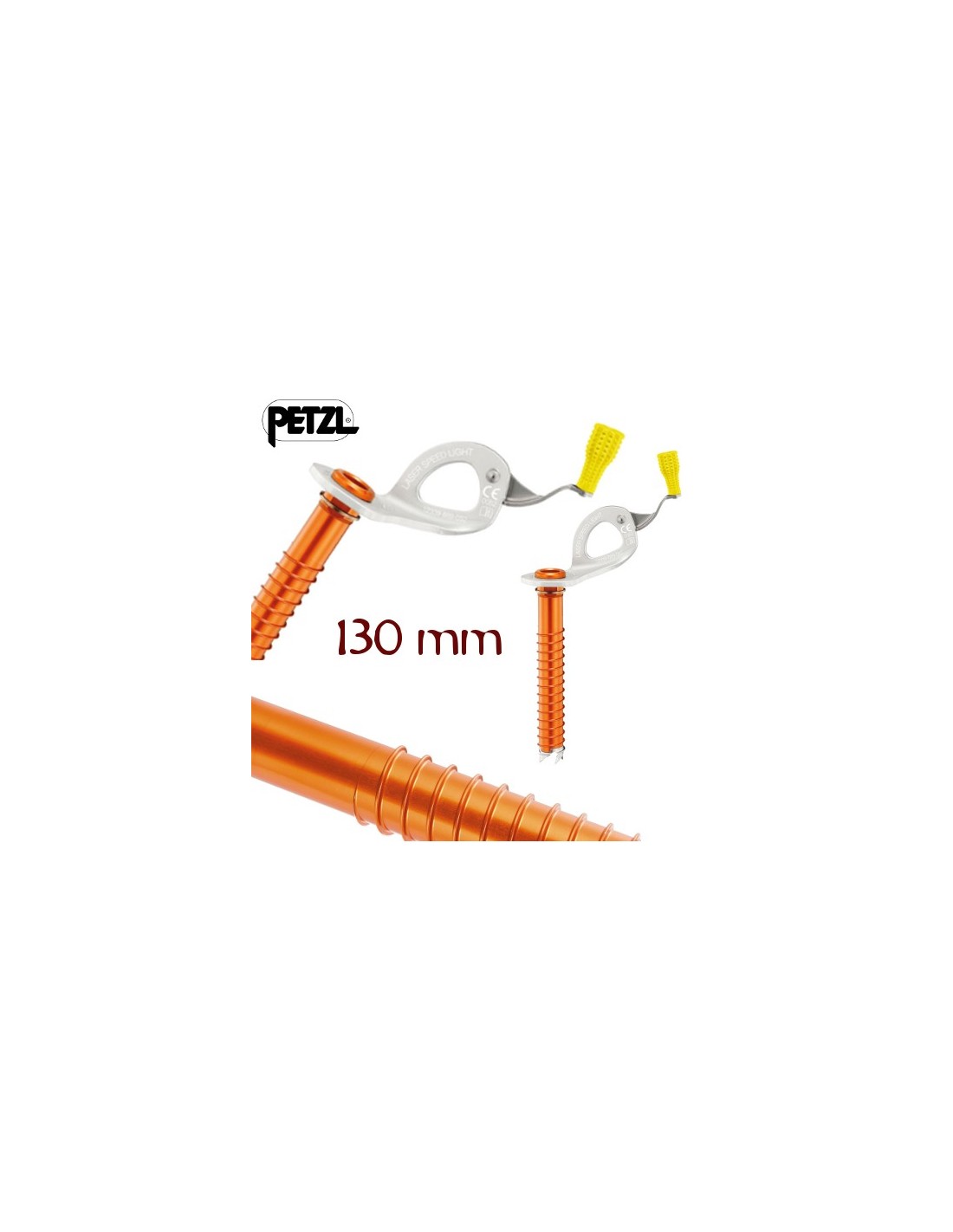 Tornillo para hielo de la marca Petzl, modelo Laser Speed Light, ultraligero, sólo 91 g, para llevar el mínimo peso en alpinismo.