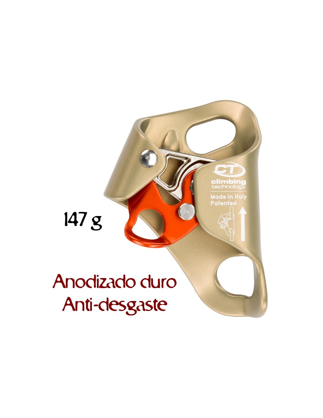 Además presenta tres orificios para evitar la acumulación de barro y reducir el esfuerzo necesario para que se deslice el dispositivo hacia arriba por la cuerda en cualquier condición. (cuerda embarrada, helada etc)