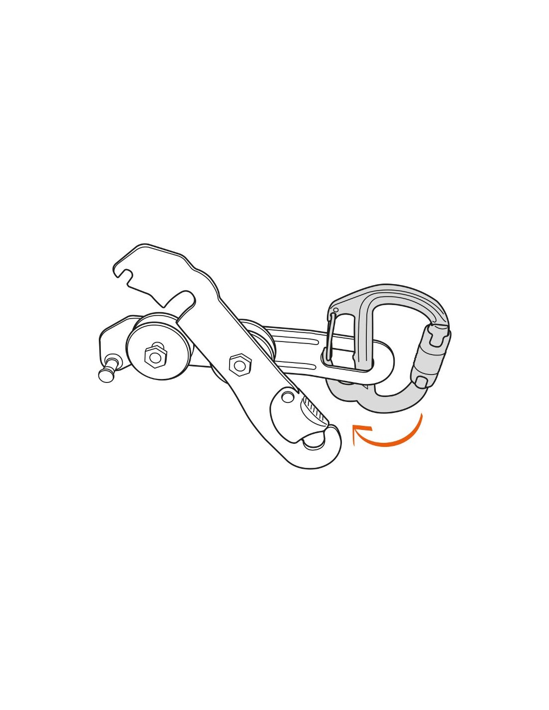 - Orificio largo de conexión que permite voltear el mosquetón FREINO Z para que el descensor no se pierda durante las transferencias del anillo portamaterial al mosquetón semicircular.