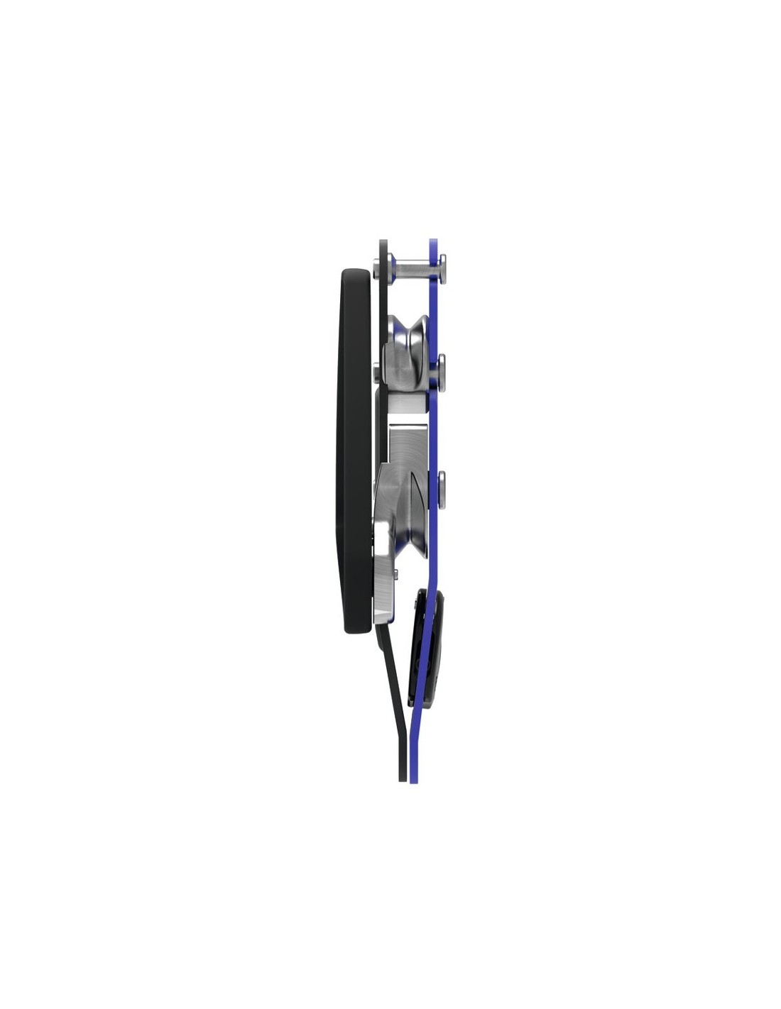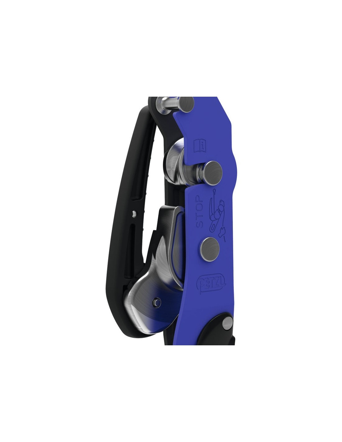 - Gatillo de cierre en la placa lateral que se puede abrir para instalar la cuerda fácilmente y mantener a la vez el aparato conectado al arnés.