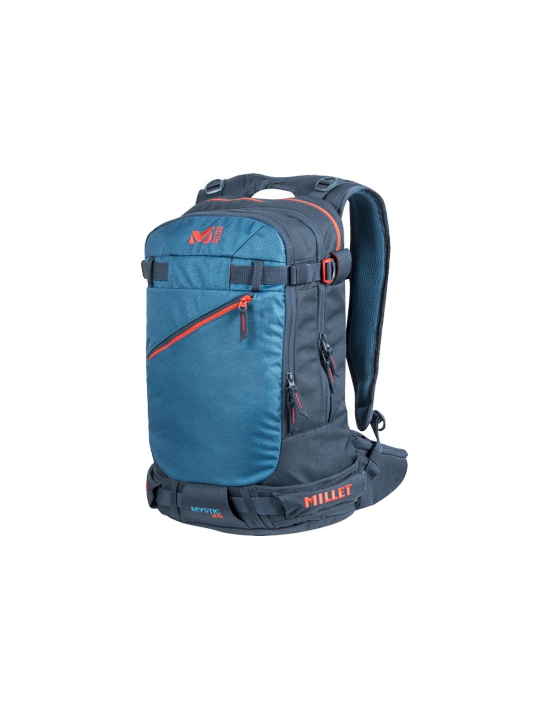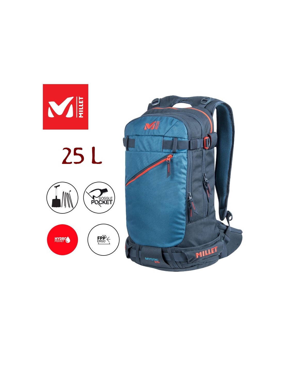 - Cinturón con bolsillo con cremallera + bolsillito ski-pass / tirantes con recordatorio de carga / silbato para rescate.