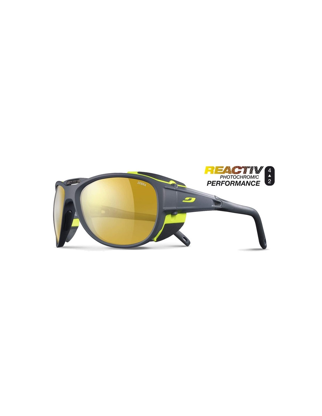 - Lentes reactive fotocromáticas: Las lentes Reactiv se oscurecen o aclaran según la intensidad luminosa. Haga el tiempo que haga, Julbo le garantiza una visión perfecta y protege su mirada de forma duradera.