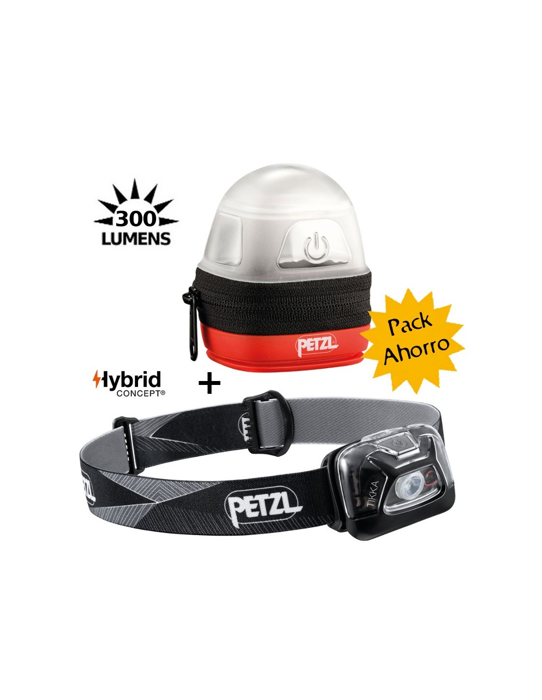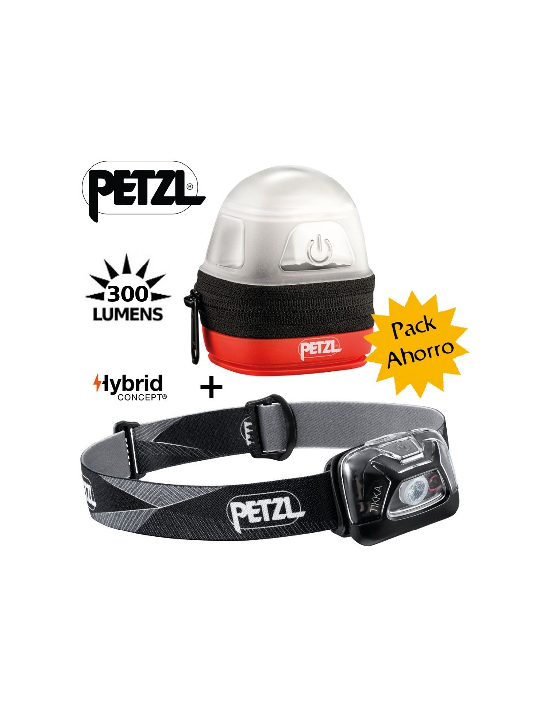 Pack ideal para camping o noches de furgoneta compuesto por el frontal Tikka de petzl de 300 lúmenes y el estuche difusor Noctilight que permite usarlo como luz de sobremesa o de techo.