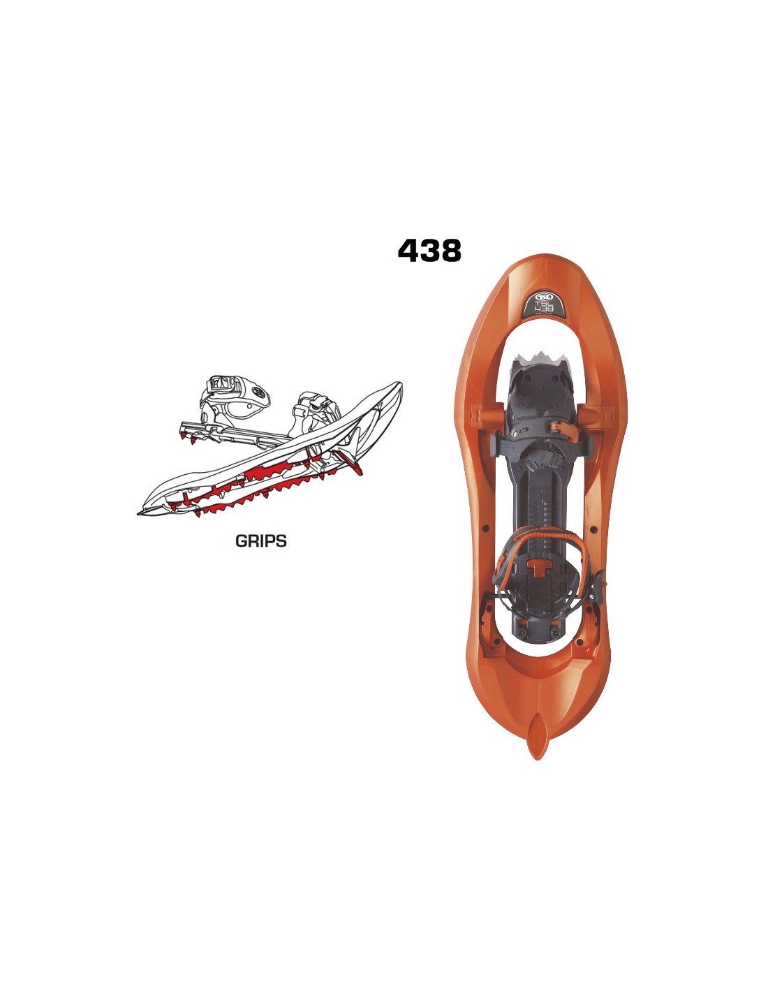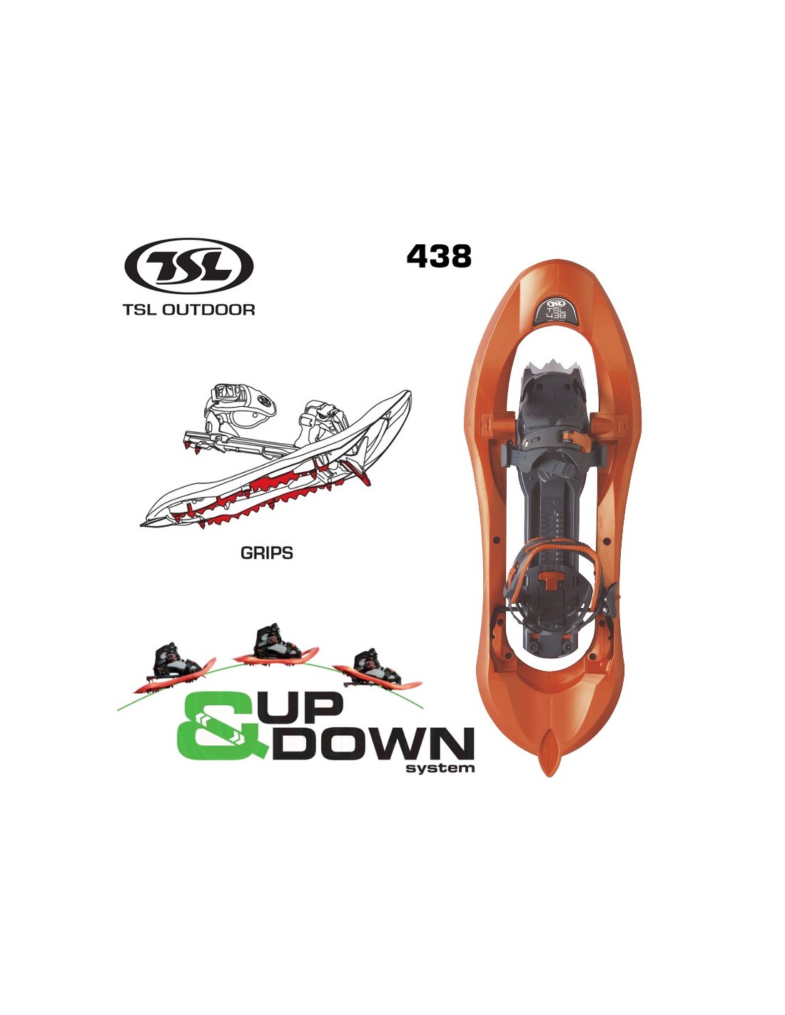La característica principal de las raquetas TSL 438 es el alza Up-Down (patente de TSL) que permite reducir los efectos de una pendiente, tanto durante el ascenso como durante el descenso (la parte trasera de la fijación pasa por debajo de la raqueta, a fin de conservar el pie en plano, evitando que el pie se apoye en la puntera de la bota).