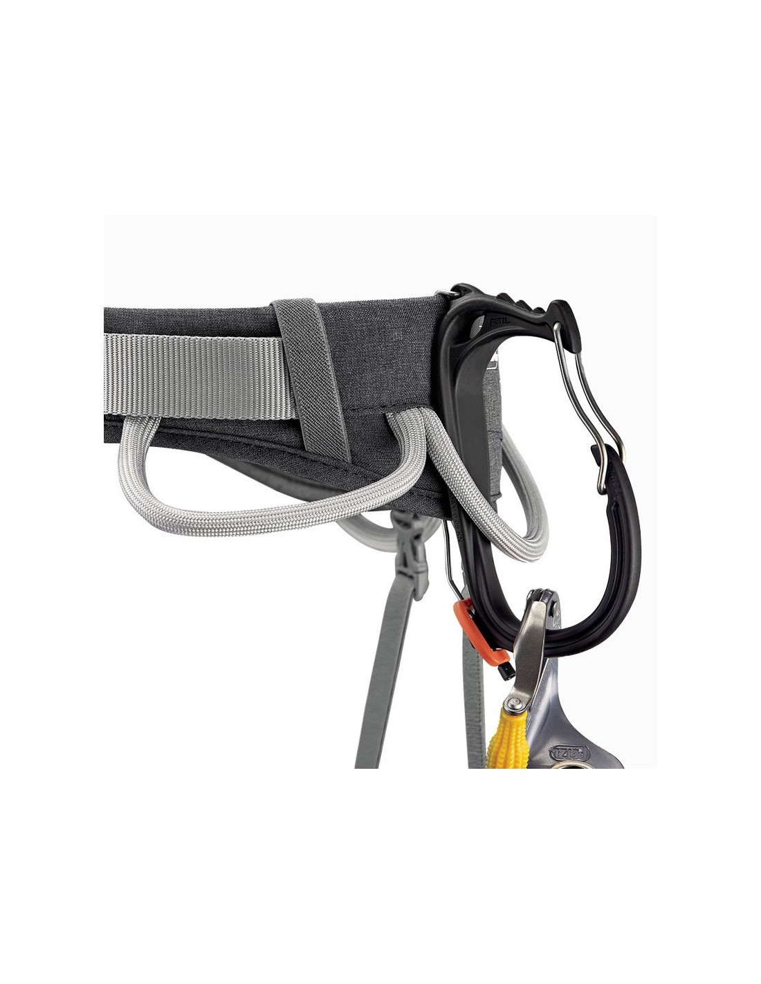 - Dos anillos portamaterial delanteros rígidos para facilitar el mosquetoneo y desmosquetoneo de las cintas.