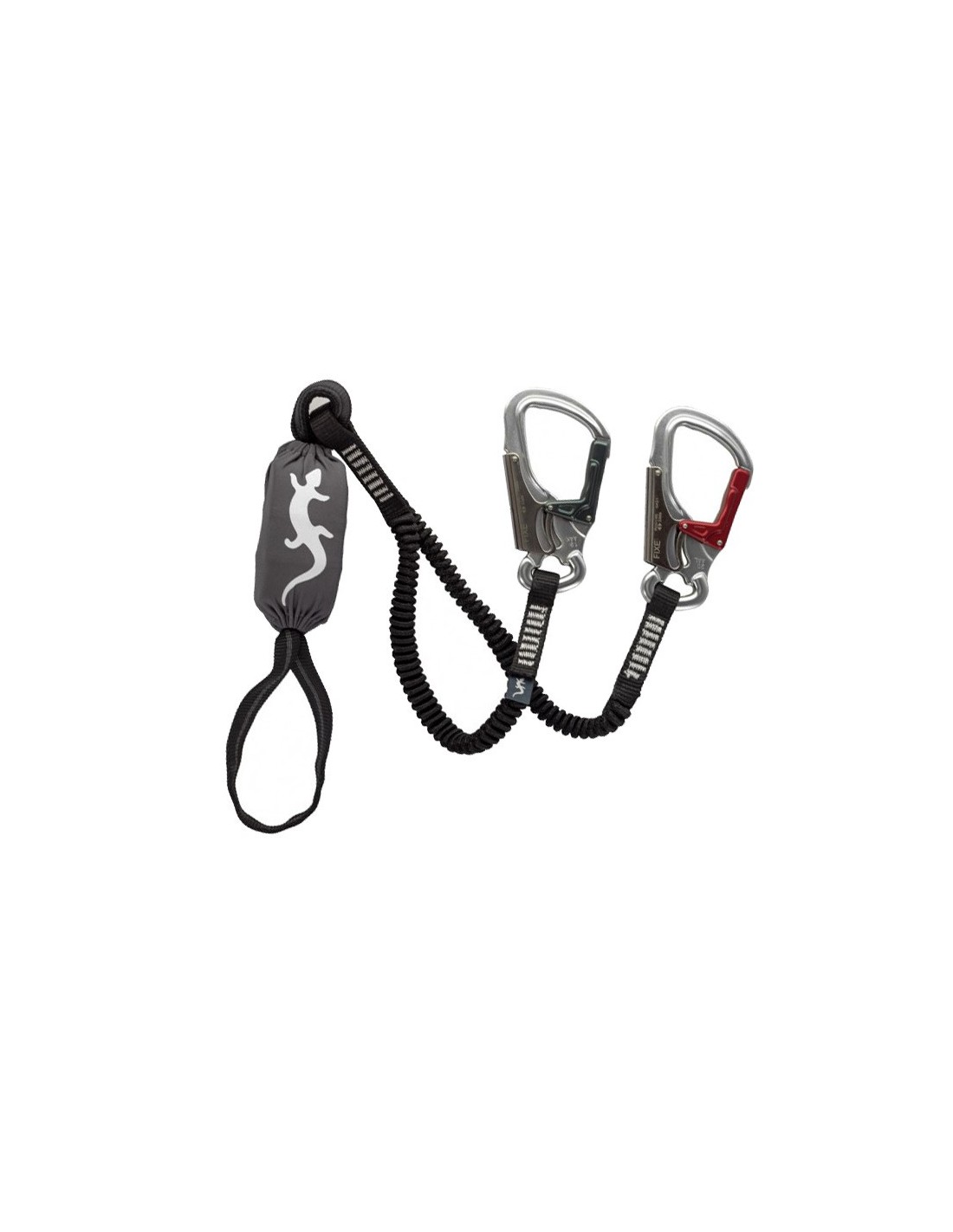 - Doble mosquetón FADERS de dos movimientos especial para vía ferrata unido al absorbedor mediante cinta elástica.