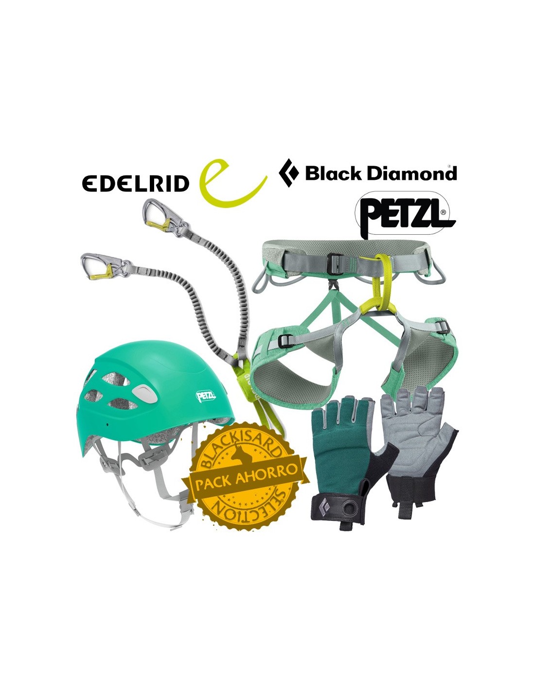 Pack ahorro de material de mujer para vía ferrata, compuesto por los siguientes elementos: